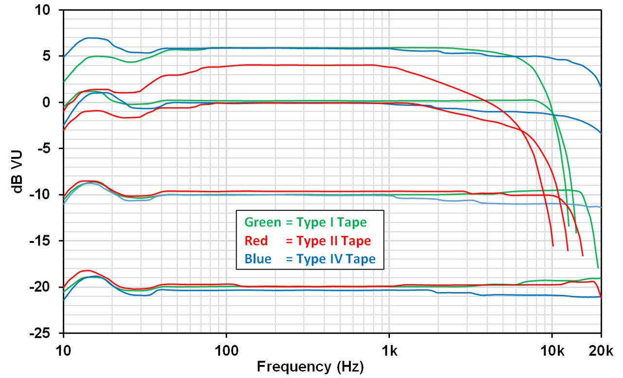 각 테이프의 타입에 따른 주파수 반응 곡선. 타입에 따라 주파수 반응도 다르지만, 소리의 레벨에 따라 주파수 반응이 비선형적이라는 것을 알 수 있다.