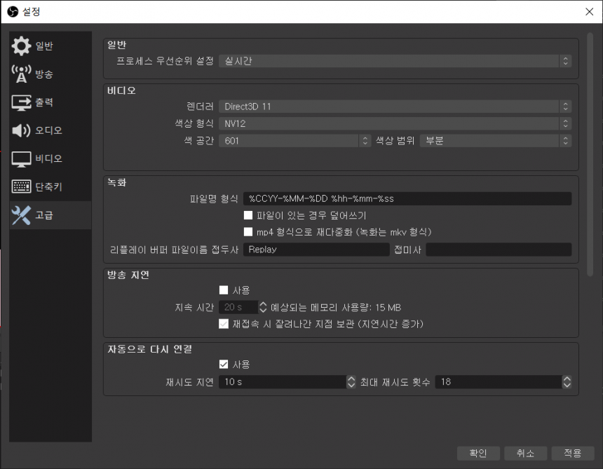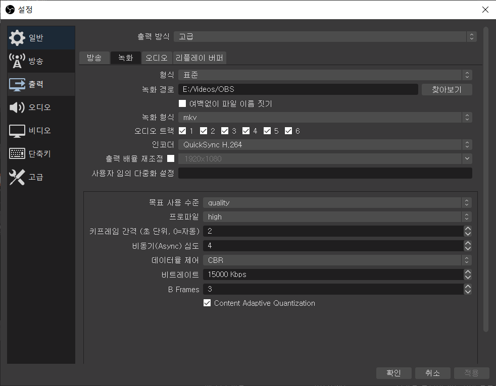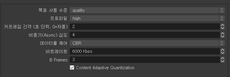 만약 CPU 네이티브 인코더인 X264 사용 시에 너무 느리게 인코딩이 되서 드롭되는 프레임이 생긴다면 속도 위주로 재조정을 해야 합니다. 하지만 하드웨어 인코더(NVECN, QSV)를 사용할 때는 거의 그럴 일은 없습니다.