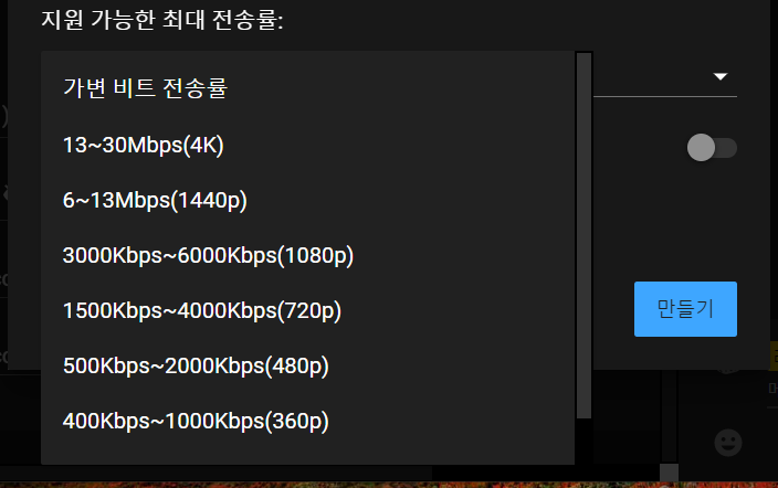 YouTube의 경우는 디폴트 스트림키 말고 새로 스트림 키를 만들 때 지정할 수 있는데 아래와 같습니다. OBS에서 해당 스트림 키와 서로 맞춰주면 됩니다.