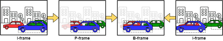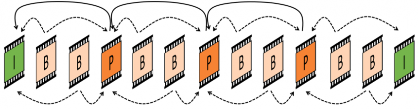 P-frame과 B-frame이 다른 부분은, P-frame은 앞의 키프레임에 비해서 바뀐 정보만을 기록하는 방식에 비하여, B-frame은 앞과 뒤의 프레임을 서로 비교하여 변동 된 정보를 찾아내서 기록하는 방식이라는 점입니다. 그래서 Bi-directional predicted 프레임이라고 합니다.