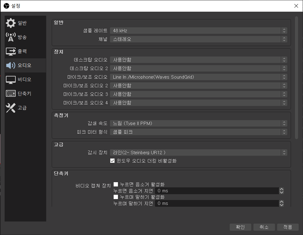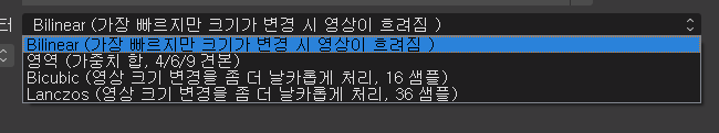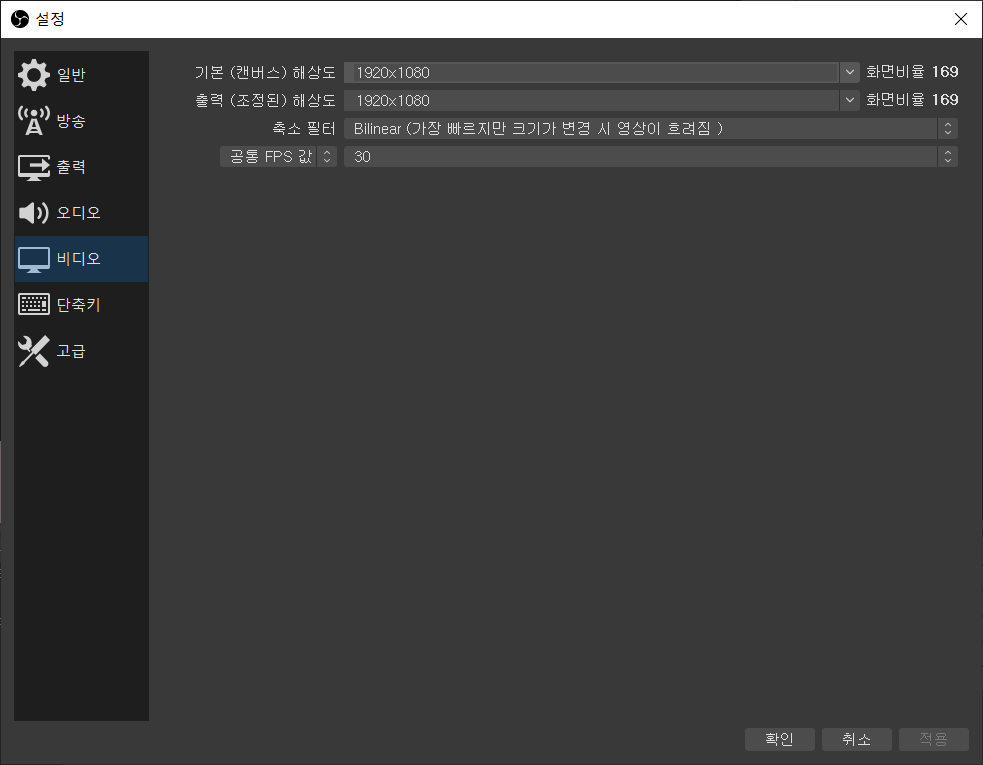 비디오탭의 내용은 OBS에서 방송나가는 화면을 볼 수 있는 “미리 보기”에 대한 설정입니다.