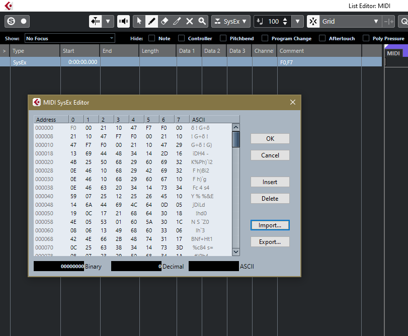 디지털 신디사이저나 MIDI 모듈은 사실 자체적으로도 채널에 지정된 악기 설정, 이펙트 설정 등을 저장하고 불러오는 기능을 제공합니다. 그러나 SysEx를 사용하면 작업 중인 곡의 프로젝트 파일에 해당 설정 데이터를 덤프(Dump)하여 저장할 수 있습니다. 나중에 프로젝트 파일에서 저장된 SysEx 데이터를 전송하면, 신디사이저나 MIDI 모듈의 설정 상태를 정확히 리콜할 수 있습니다. 이는 곡 작업과 라이브 환경에서 동일한 설정을 빠르게 재현하는 데 매우 유용합니다.