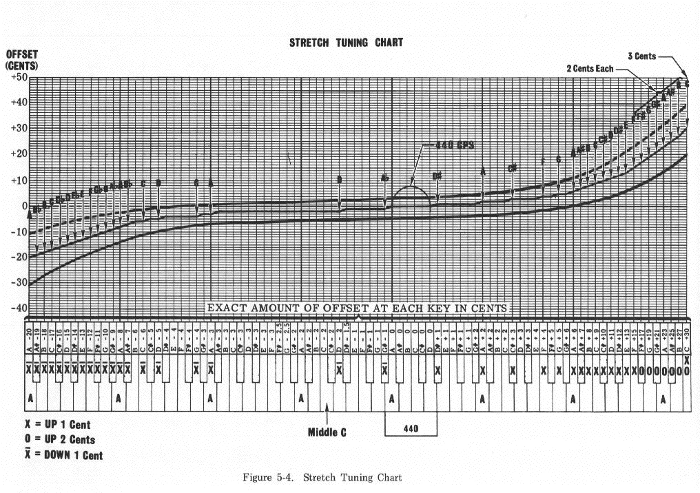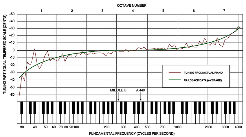 - 그래서 실제 조율 과정에서는 저음은 기준보다 약간 낮게, 고음은 기준보다 약간 높게 튜닝하게 됩니다(이 현상을 '스트레치'라고 함).