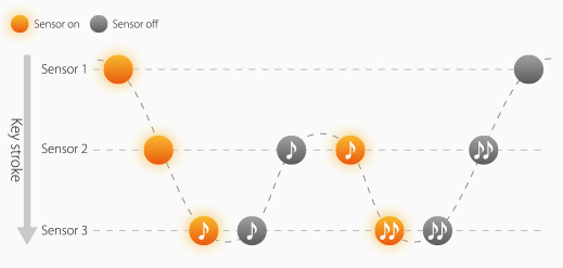 보통 MIDI를 이용한 건반의 입력 강도(Velocity)측정에는 2개의 센서를 통한 시간차이를 계산하게 되지만, 센서를 하나 더 넣어서 음이 끝나는 시점에 대한 정보까지 입력되도록 하는 방식이다.