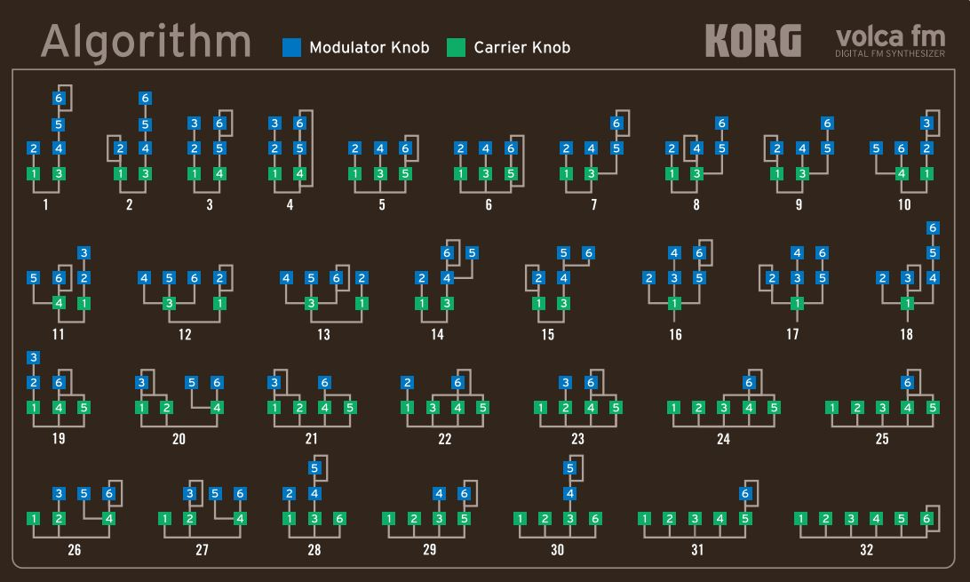 FM 신디사이저에서는 미리 패치 프로그램 제작자가 오퍼레이터들을 모듈레이터와 캐리어로 조합하는 알고리즘을 만들어 놓습니다. 연주자는 해당하는 오퍼레이터(모듈레이터, 캐리어)를 얼마나 동작시킬 것인지만 변경하여 사용하게 됩니다. 어떤 알고리즘은 오르간 소리를 재현하는 것에 효과적이고 다른 알고리즘은 피아노 소리를 재현하는 것에 효과적이고, 이런식으로 스트링, 관악기, 타악기 등 각각의 악기 카테고리 별로 효과적인 알고리즘이 있습니다.