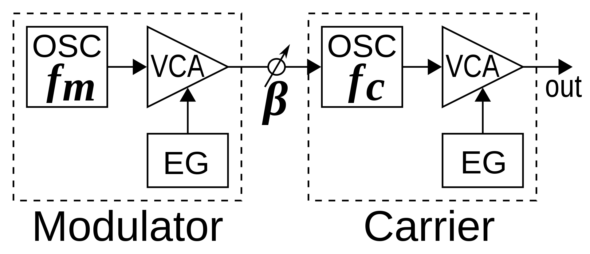 FM 신디사이저의 오퍼레이터는 사인파를 발생시키는 오실레이터와 엔벨로프 제너레이터, VCA가 하나의 그룹으로 구성되어 있습니다. FM 신디사이저는 오퍼레이터를 모듈레이터 또는 캐리어로 사용함으로써 주파수 모듈레이션을 구현합니다.