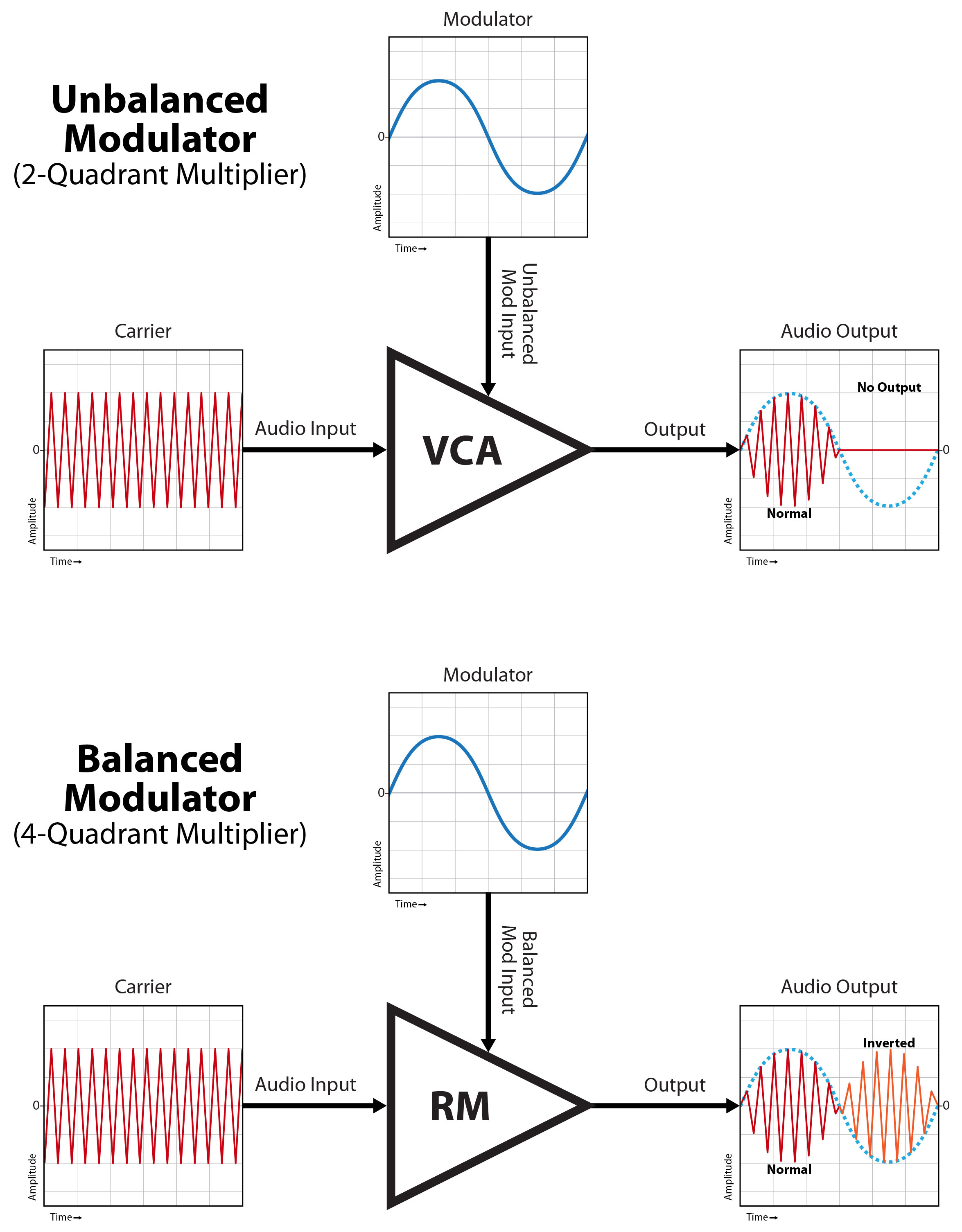 우리가 신디사이저에서 AM(진폭 변조) 음색 합성 효과를 얻기 위해서 일반적인 AM 회로를 적용하면 문제가 생깁니다. AM 회로는 + 방향의 전압으로 바이어스된 파형만 변조할 수 있기 때문에, 신디사이저의 VCO에서 생성된 + 와 - 전압이 공존하는 파형을 변조하기 위해서는 AM(진폭 변조)를 사용할 수 없습니다. 따라서 신디사이저에서는 이러한 AM 음색 합성 효과를 얻기 위해서 AM 회로 대신 RM(링 모듈레이터)를 사용하게 됩니다. 신디사이저에 따라서 RM(Ring Modulator)로 표기하는 신디사이저도 있고, 사용자가 알아보기 쉽게 그냥 AM(진폭 변조)으로 표기4)하는 신디사이저도 있습니다.