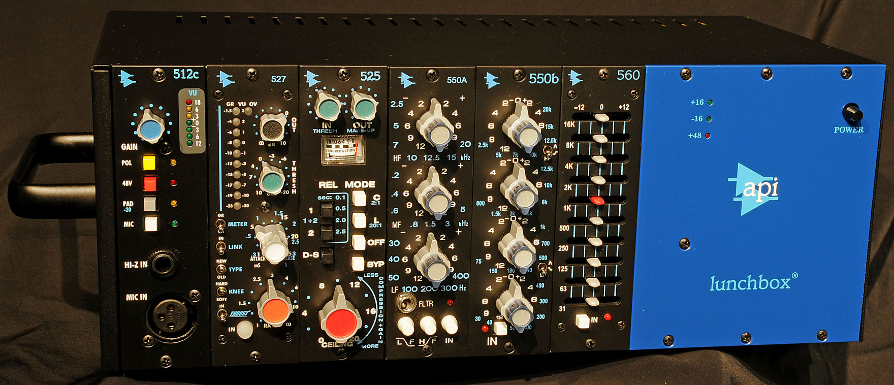 프레임에는 전원 공급 장치, 입출력 커넥터 등이 있으며, 믹서나 따로 사이드체인 입력 등이 제공되기도 한다. 500 시리즈 형식에는 다양한 제조사의 마이크 프리앰프, DI, 이퀄라이저, 컴프레서, 리미터와 같은 아웃보드들이 있으며, 표준화 된 디자인, 컴팩트한 폼 팩터, 휴대성, 간소화된 전원 공급 등에 장점을 제공한다.1)