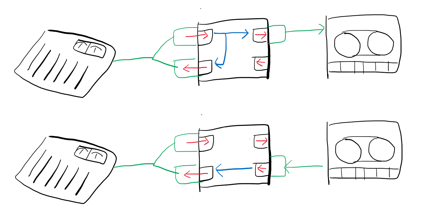 패치베이를 셋업하는 방식이다. 그림은 패치베이의 단면이다. 패치베이는 기본적으로 TRS 커넥터를 사용하면서 패치베이이 연결 방식 따라 신호가 스플릿 되기도 한다. 따라서, 패치베이에는 48V 팬텀 파워의 사용에 매우 주의해야 한다. 또한 패치베이에 커넥터가 연결되는 순간 XLR 커넥터와는 다르게 팁과 링이 순간적으로 쇼트되는 시점이 발생한다. 이때 48V 팬텀 파워가 순간적으로 마이크의 출력 트랜스포머에 큰 충격을 줄 수 있다.1)