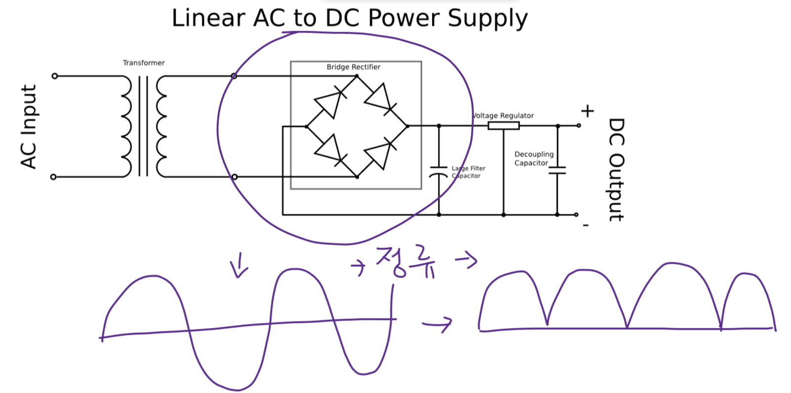 감압한 교류를 다시 다이오드를 이용한 정류 회로로 정류한다.
