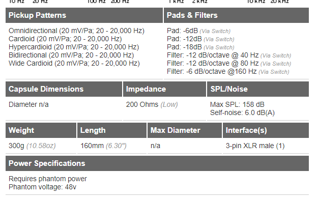 10mV/Pa, 142dBSPL이므로, 최대 출력 레벨은, 10dBu인데도 이 마이크는 PAD 스위치를 가지고 있다. 사실 마이크 프리앰프의 최대 입력이 10dBu가 넘는 제품을 쓴다면 PAD는 사실상 사용할 일이 없어 보인다. 오히려 최대 입력이 22dBu 정도 된다면 12dBu 정도가 남게 된다. 다만 마이크의 PAD 를 이용하면 감도를 낮추는 부가적인 효과가 있어서, 주변 소음 억제에는 도움이 될 수 있다.