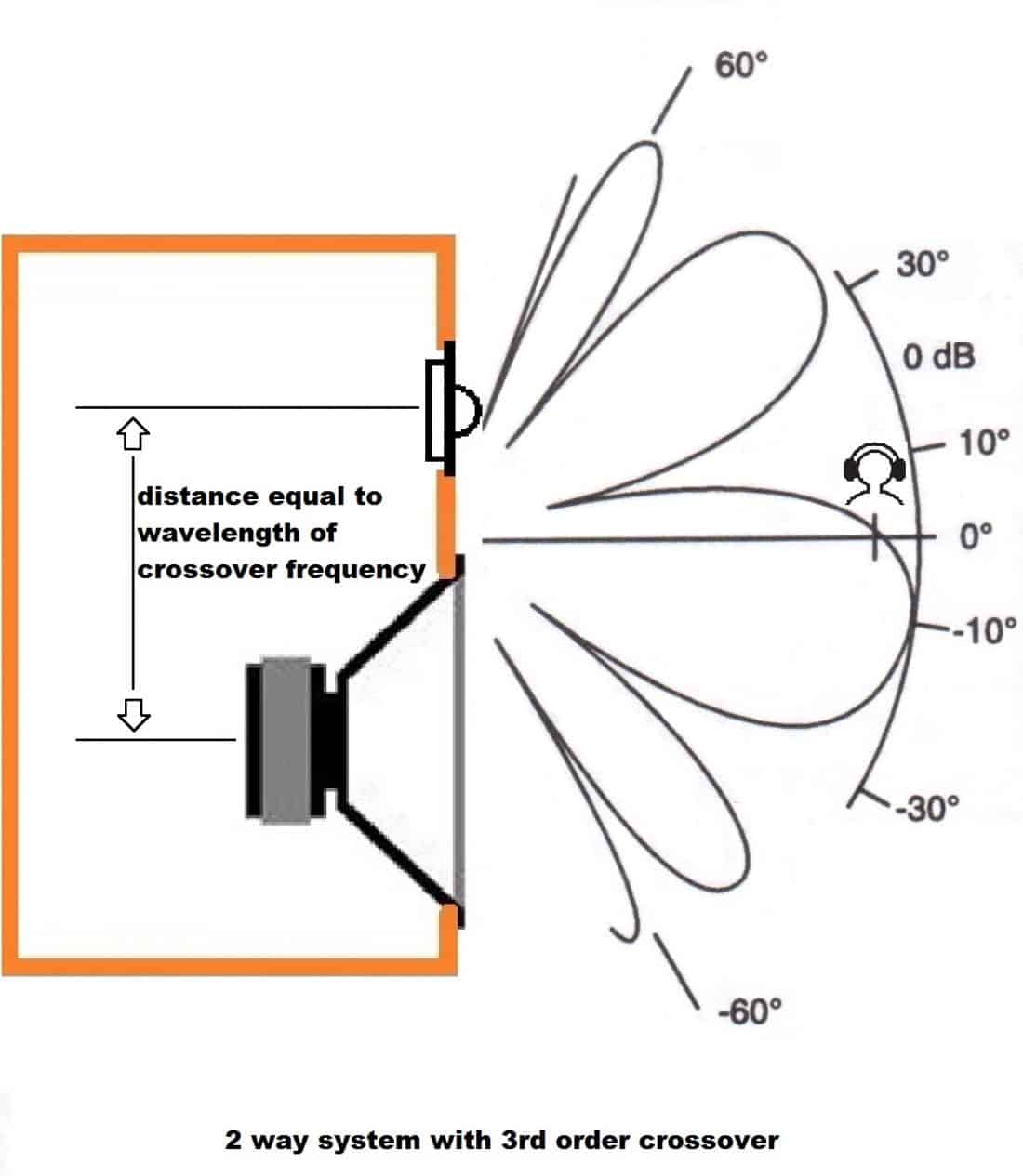 위 그림처럼 트위터와 우퍼간격에 의해 크로스오버 주파수에서 로빙 에러(Lobing error)가 발생하며 이는 수직지향성에서 나타난다.