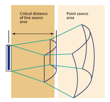 역제곱 법칙은 점음원4)의 경우 2배의 거리에서 -6dB이지만, 선음원5)의 경우에는 2배의 거리에서 -3dB로 감소 되므로, 라인 어레이나, 컬럼 어레이 같은 스피커의 경우는 다를 수 있다.6) 우리가 점음원을 기준으로 계산하는 이유는 컬럼 어레이나 라인 어레이를 제외한 일반적인 2-way 나 3-way 스피커가 “포인트 소스”7) 스피커 이기 때문이다.