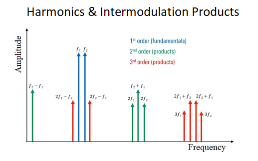 두 주파수 f₁과 f₂가 입력되면, 비선형 시스템에서 다음과 같은 합/차 주파수가 생성됩니다: