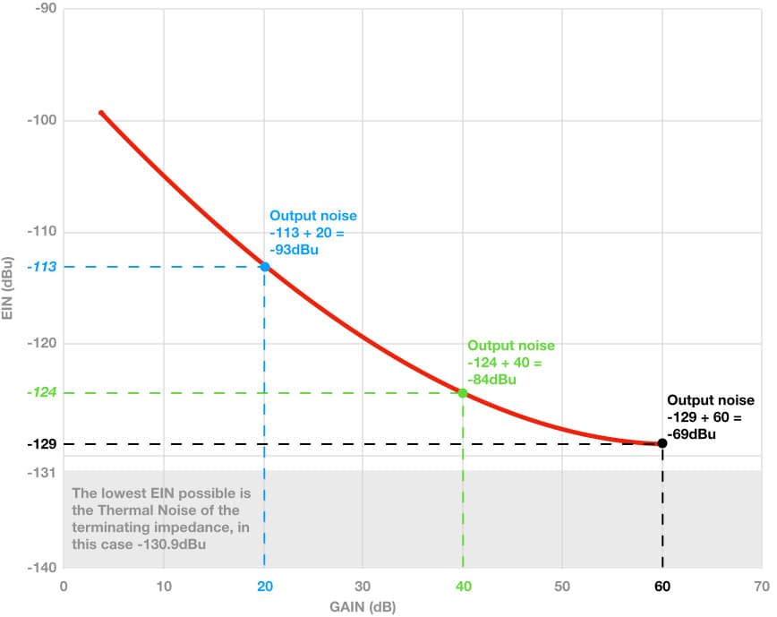 위의 그래프를 보면 프리앰프에서 게인을 높히면 높힐수록 EIN 수치는 점점 줄어듬을 알 수 있다. 즉 게인을 높히면 노이즈 플로어도 내려가는 것이다. 하지만, 여기서 올라간 게인 수치를 더하면 게인을 점점 증가시킴에 따라 노이즈도 증가함을 알 수 있다. 게인이 20dB 일 때의 노이즈 플로어는 -93dBu, 게인이 60dB 일 때의 노이즈 플로어는 -69dBu 이다.