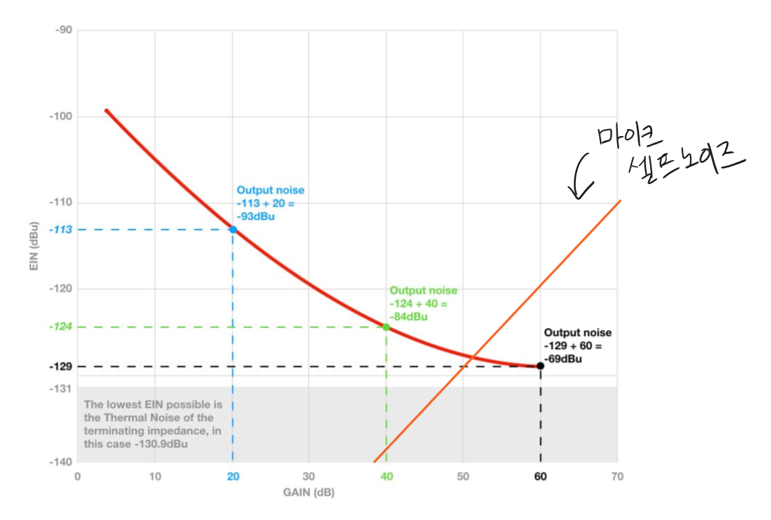 즉, 프리앰프에 마이크를 연결하여 사용할 때, 마이크의 노이즈 플로어도 게인에 의해 증가하기 때문에 게인을 높히다보면 마이크의 노이즈가 프리앰프의 노이즈보다 높아지는 지점이 있다.