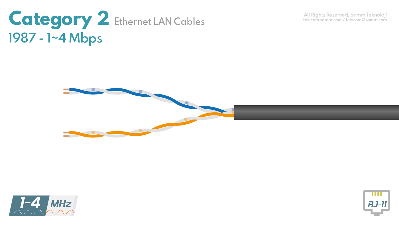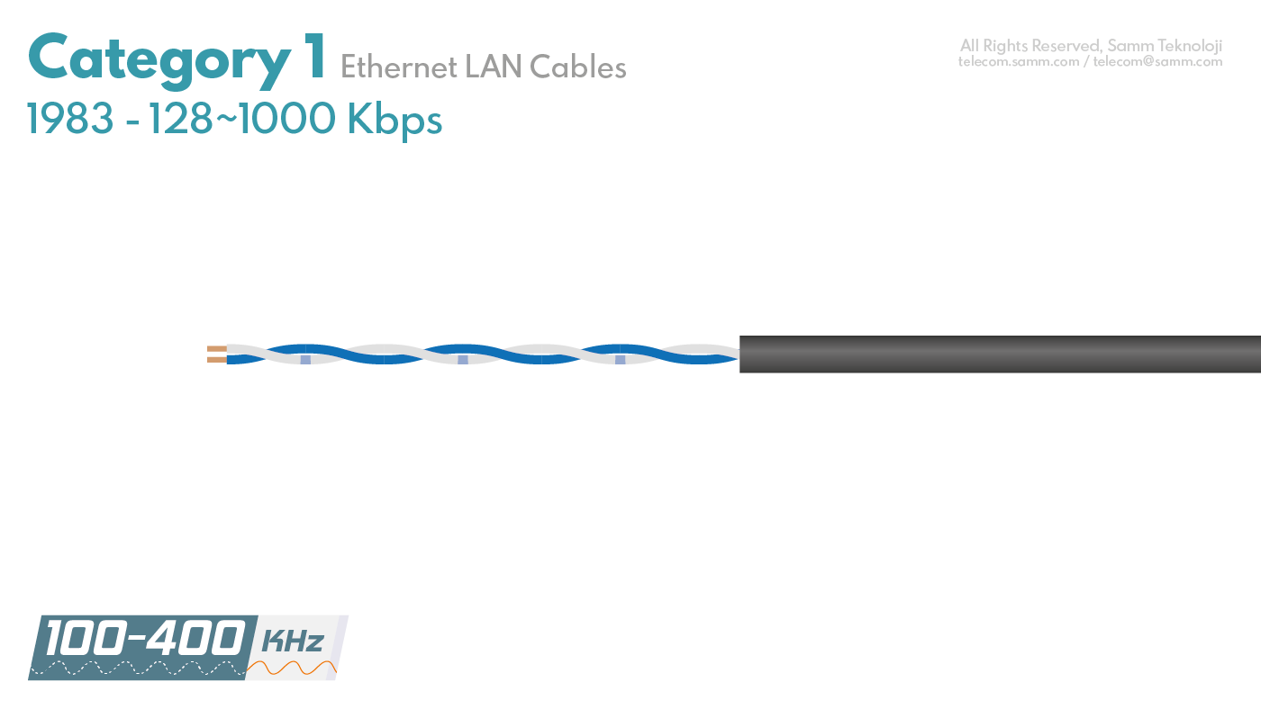 | CAT1 | 1 Mbps | 0.4 MHz | Telephone and modem lines | |