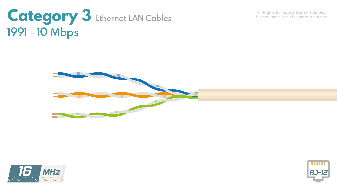 | CAT3 | 10 Mbps | 16 MHz | 100 m (328 ft.) | 10BaseT Ethernet |