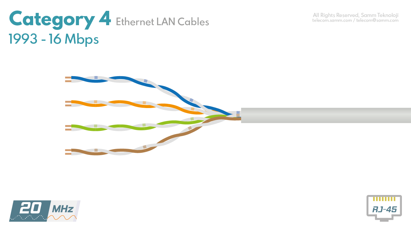 CAT3와 마찬가지로 카테고리 4 케이블은 일반적으로 전체 교체 비용이 만만치 않은 오래된 건물에서 볼 수 있습니다. 16Mbps의 데이터 속도를 가지며 주로 IBM 토큰 링 네트워크에 사용되었습니다.