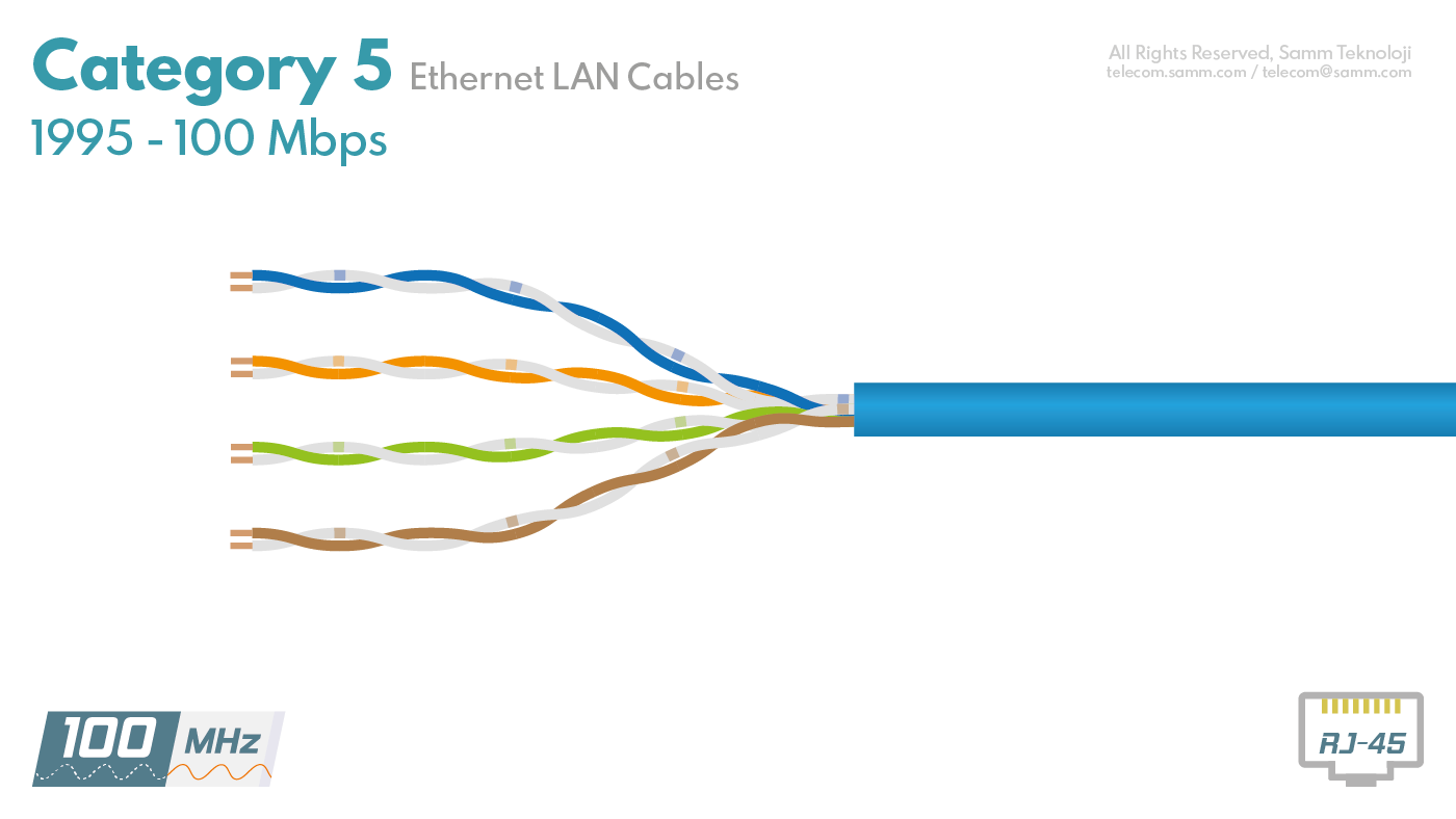 | CAT5 | 100 Mbps | 100 MHz | 100 m (328 ft.) | 100BaseT Ethernet |