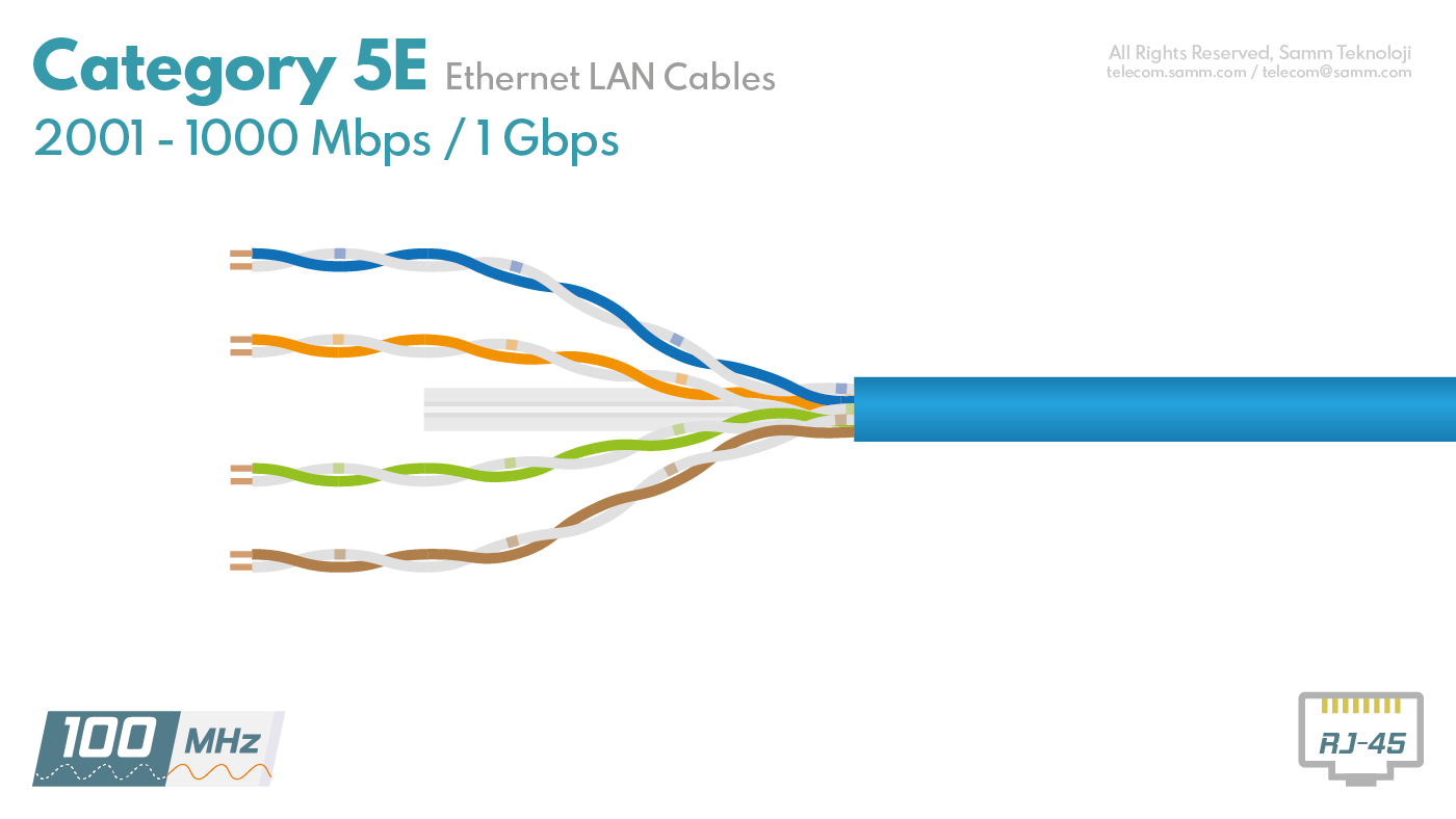 | CAT5e | 1 Gbps | 100 MHz | 100 m (328 ft.) | 100BaseT Ethernet, residential homes |