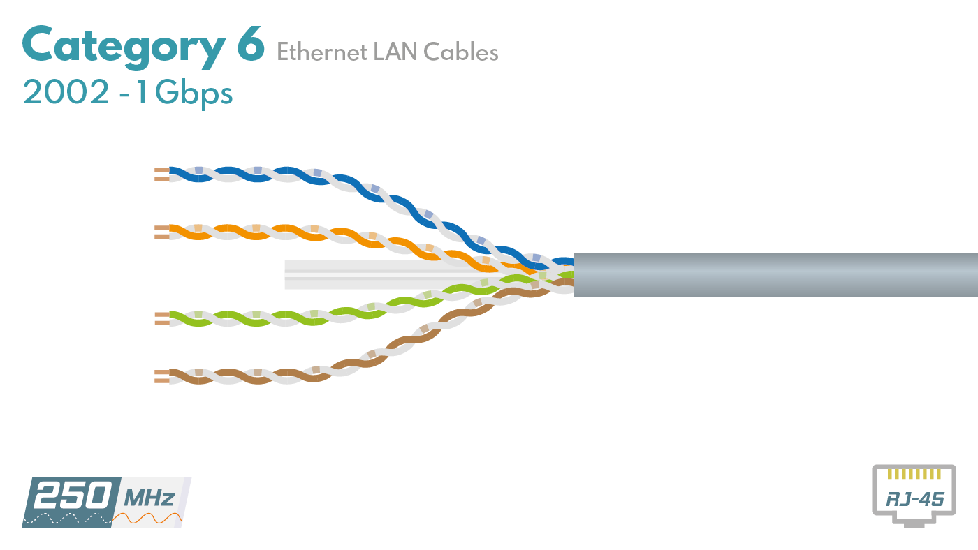 | CAT6 | 1 Gbps | 250 MHz | 100 m (328 ft.), 10Gb at 37 m (121 ft.) | Gigabit Ethernet, commercial buildings |