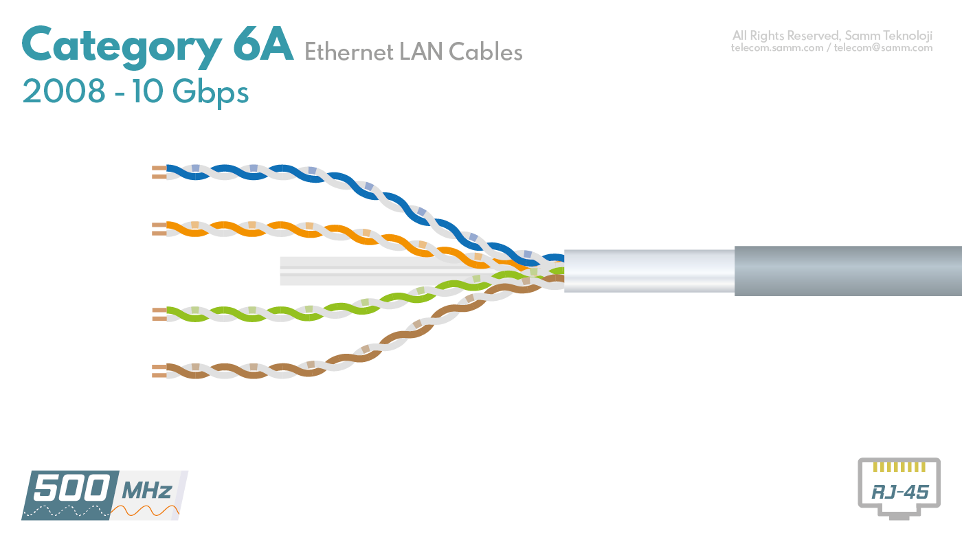 | CAT6a | 10 Gbps | 500 MHz | 100 m (328 ft.) | Gigabit Ethernet in data centers and commercial buildings |