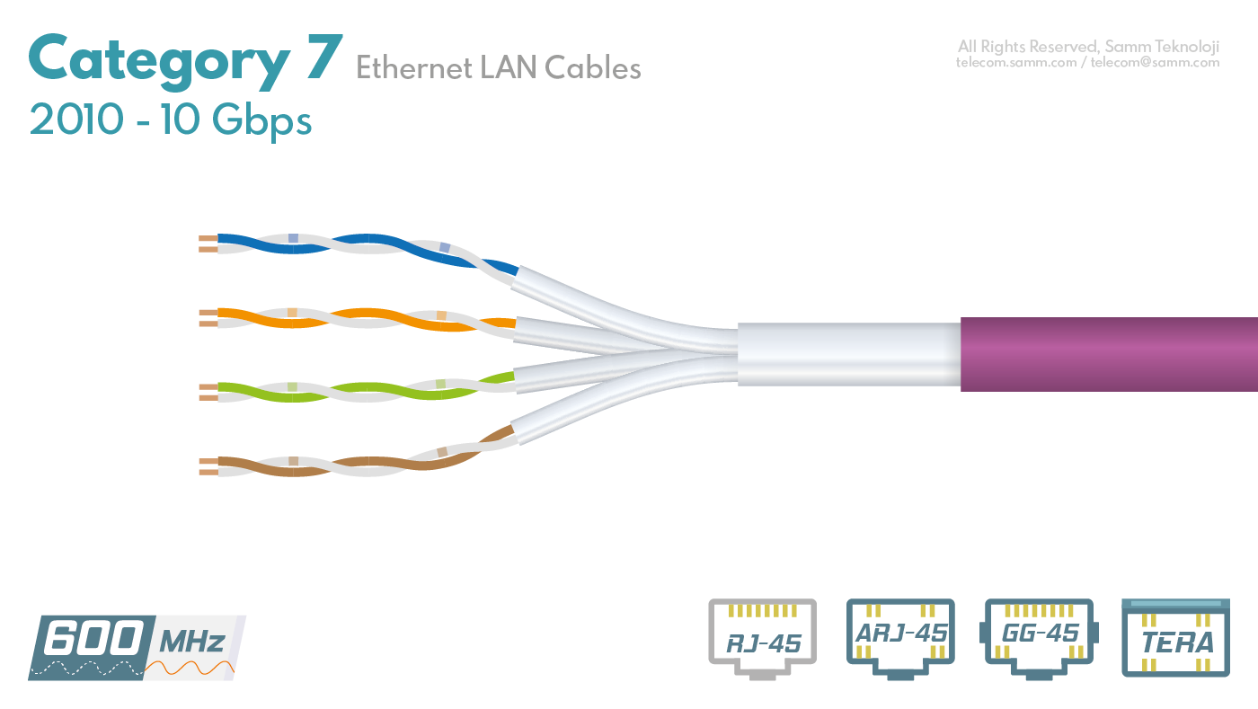 | CAT7 | 10 Gbps | 600 MHz | 100 m (328 ft.) | 10 Gbps Core Infrastructure |
