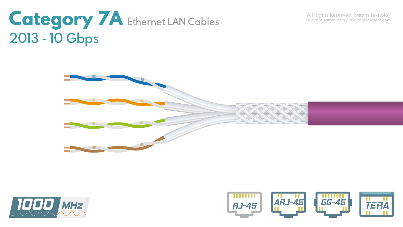 | CAT7a | 10 Gbps | 1000 MHz | 100 m (328 ft.), 40Gb at 50 m (164 ft.) | 10 Gbps Core Infrastructure |