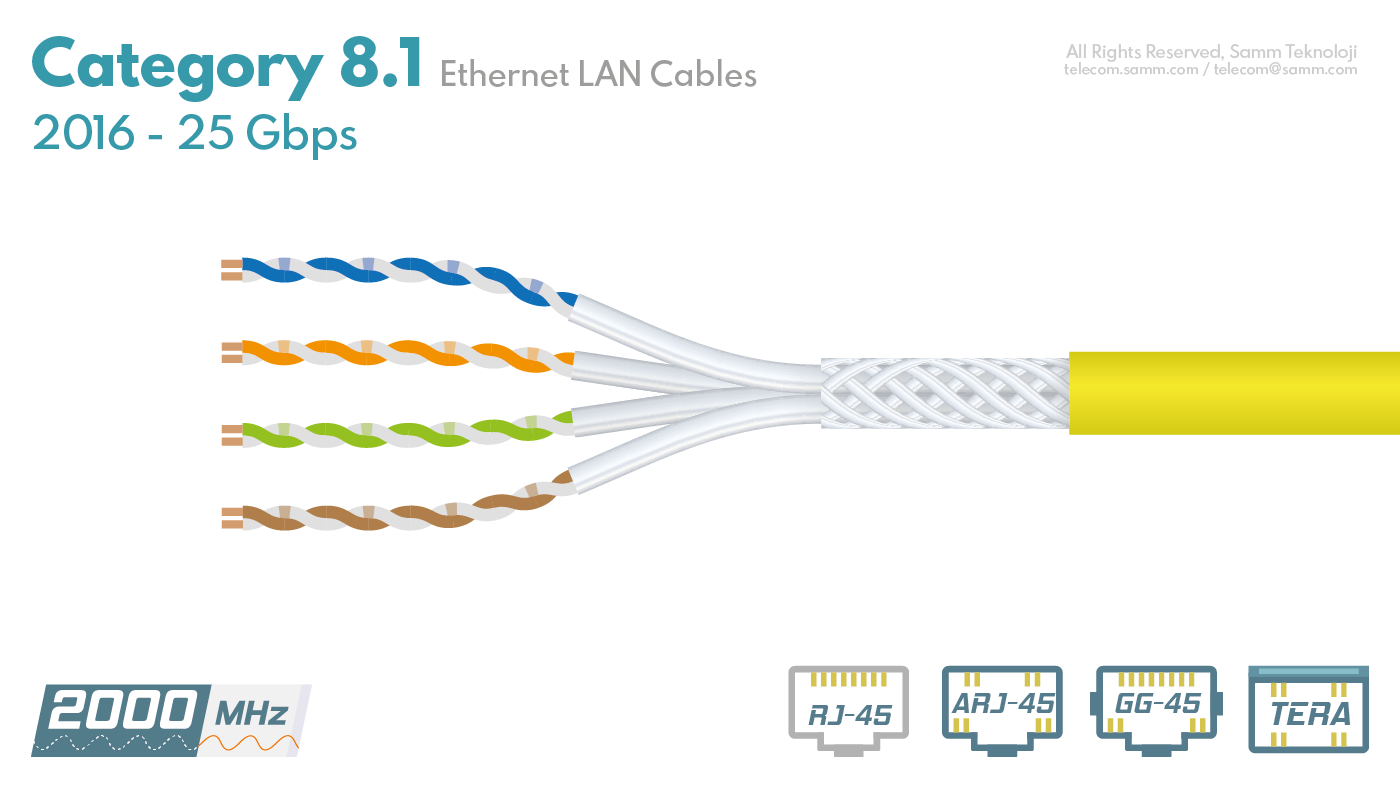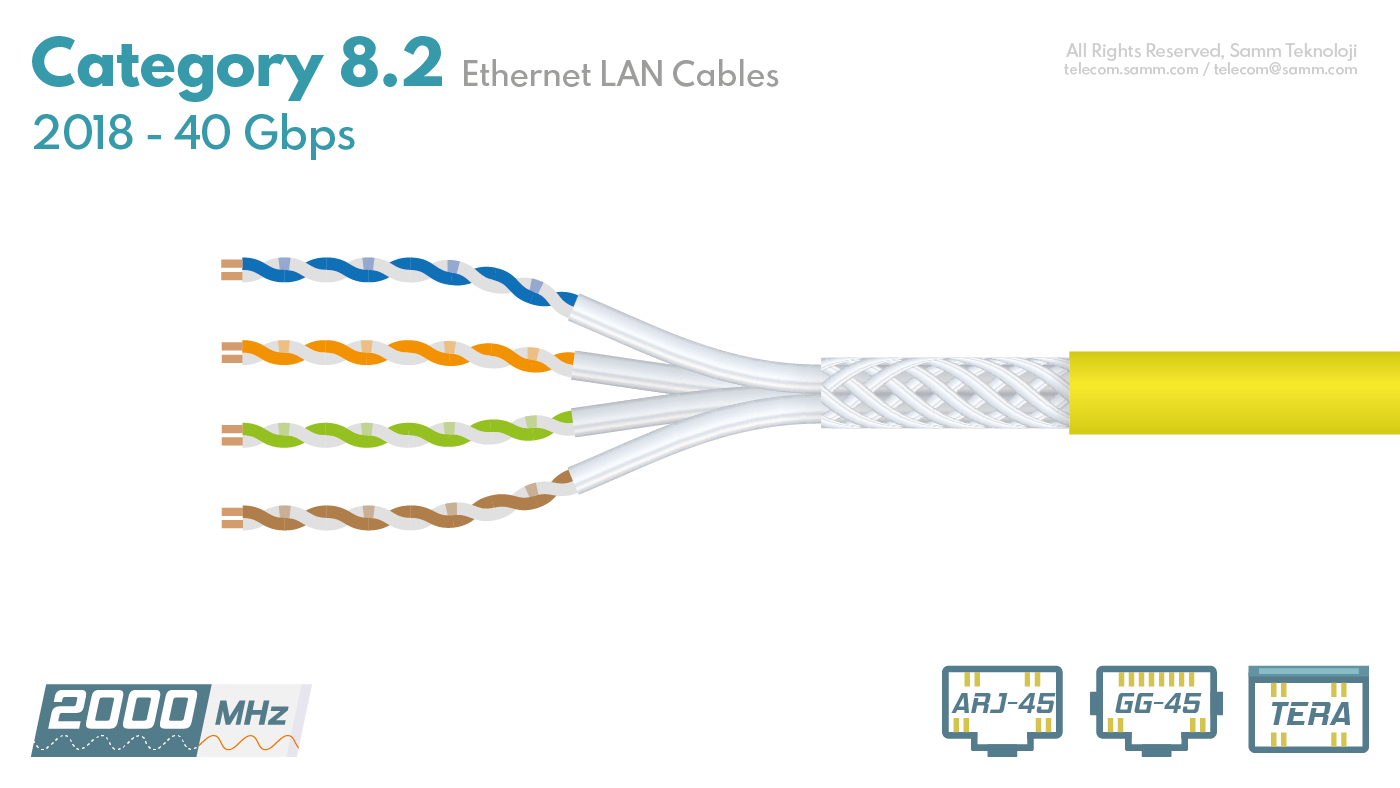 | CAT8 | 25 Gbps (CAT8.1), 40 Gbps (CAT8.2) | 2000 MHz | 30 m (98 ft.) | 25 Gbps/40 Gbps Core Infrastructure |