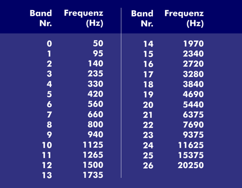 실험적으로 사람이 인지하는 크리티컬 밴드는 전 주파수에서 27개의 대역폭으로 나눈 구간을 사용하고 있습니다.