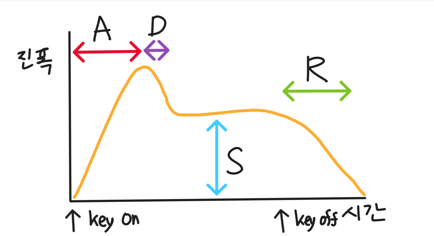 Attack은 음파의 볼륨 또는 진폭의 초기 상승을 말하며 소리가 최고 수준에 도달하는 속도를 나타냅니다. Decay는 볼륨 또는 진폭의 후속 감소를 말하며 초기 어택 후 소리의 볼륨이 얼마나 빨리 또는 느리게 감소하는지 설명합니다. Sustain은 음량이나 진폭이 일정하게 유지되는 소리의 정상 상태 부분을 말합니다. Release는 음량 또는 진폭의 최종 감소를 의미하며 Sustain 부분 이후 사운드가 얼마나 빨리 또는 느리게 사라지는지를 나타냅니다.
