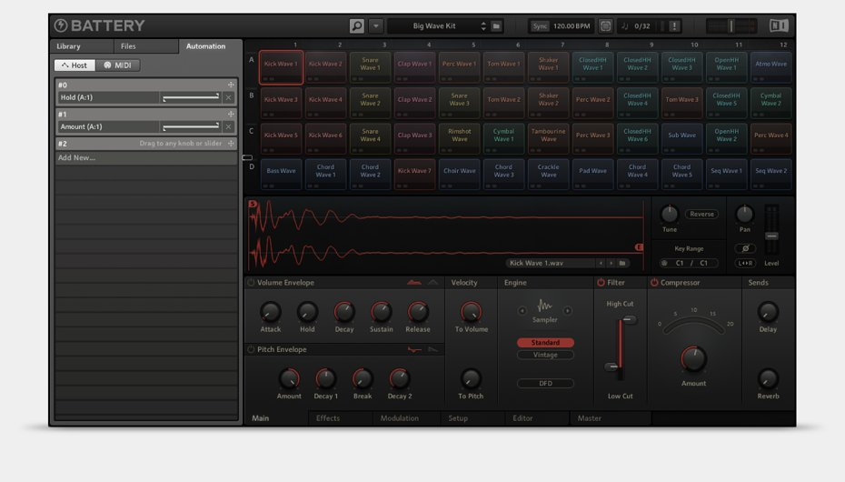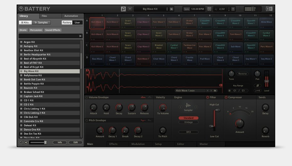 Native Instruments Battery는 드럼 샘플링과 비트 프로그래밍에 특화된 소프트웨어 드럼 샘플러입니다. 직관적이고 빠른 워크플로우, 강력한 샘플 편집 기능, 그리고 다양한 드럼 키트/샘플 라이브러리로 현대 음악 제작에서 널리 사용되는 표준 도구입니다.