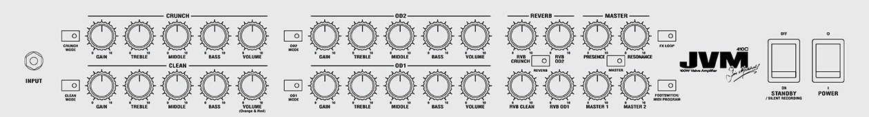 클린, 크런치, OD1, OD2의 4 채널로 구성되어 있으며 각 채널의 게인 모드는 다시 그린, 오렌지, 레드의 3가지로 동작한다. JVM 앰프 하나로 낼 수 있는 톤 컬러는 4채널 x 3컬러 = 총 12개의 톤 컬러를 낼 수 있다.
