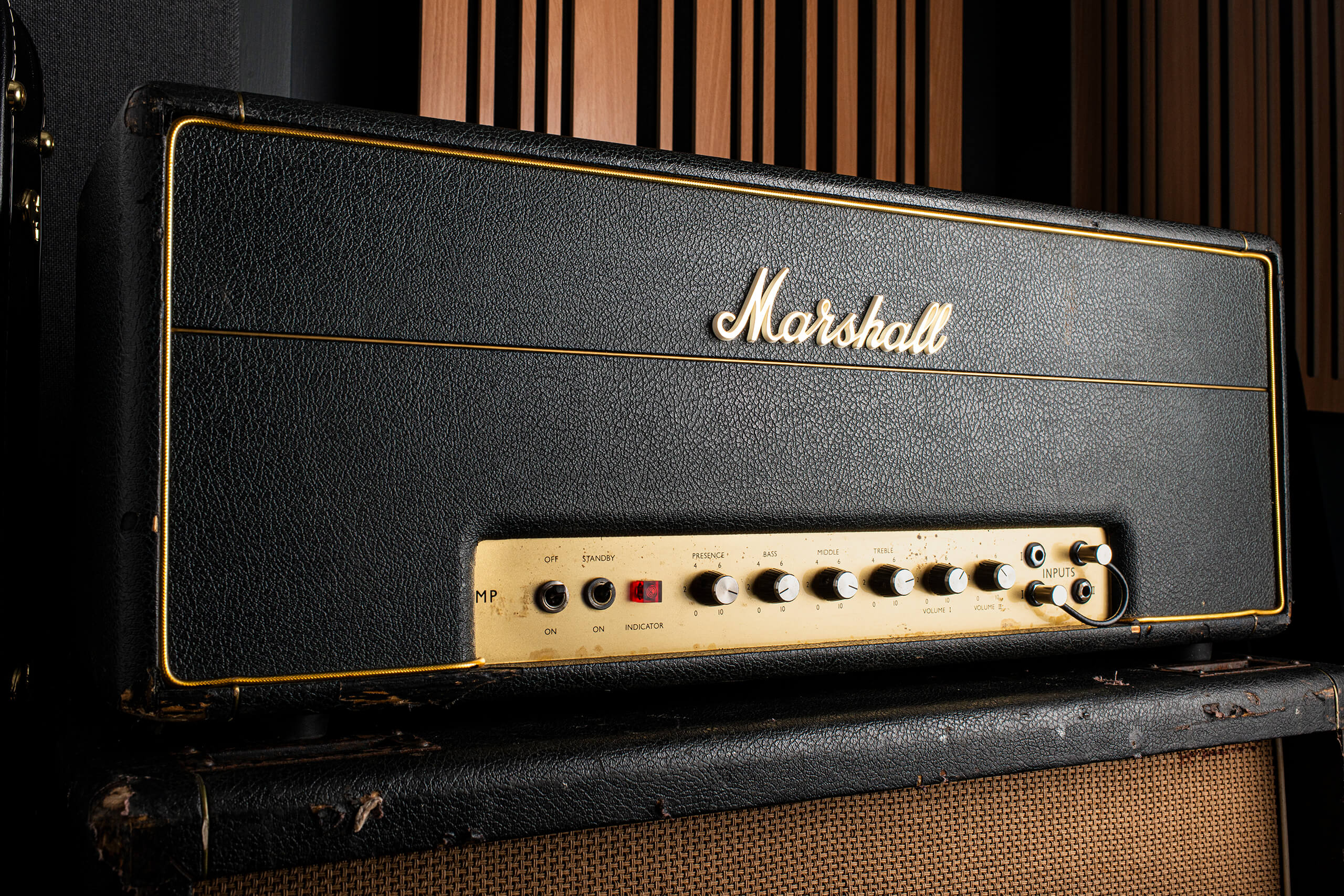 1967년 100W JTM50/100 Plexi 베이스 앰프. KT88 파워 튜브 + 플렉시글라스 패널로 깊은 저역 + 거대한 헤드룸을 제공하는 클래식 Marshall 스택의 시작점.