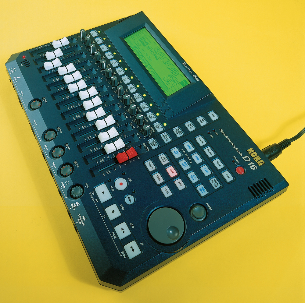 Korg D16은 16 트랙의 하드 디스크 레코딩을 제공하면서도 매우 휴대성이 뛰어나며, 24채널 믹서 섹션과 내부 2.1GB 하드 드라이브를 갖추고 있습니다. 롤랜드의 VS1680과 경쟁하는 제품으로, 터치스크린, 200개 이상의 내장 리듬 패턴, 트랙당 7개의 가상 트랙 등 다양한 기능을 제공합니다.