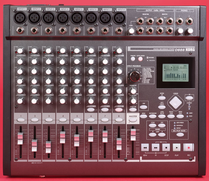 Korg D888은 8트랙, 8채널, 8버스 레코더로, 550파운드 이하의 경쟁력 있는 가격으로 출시되었습니다. 최첨단 디지털 레코딩 장치라기보다는 8채널 아날로그 믹서처럼 보이도록 설계된 것이 특징입니다.