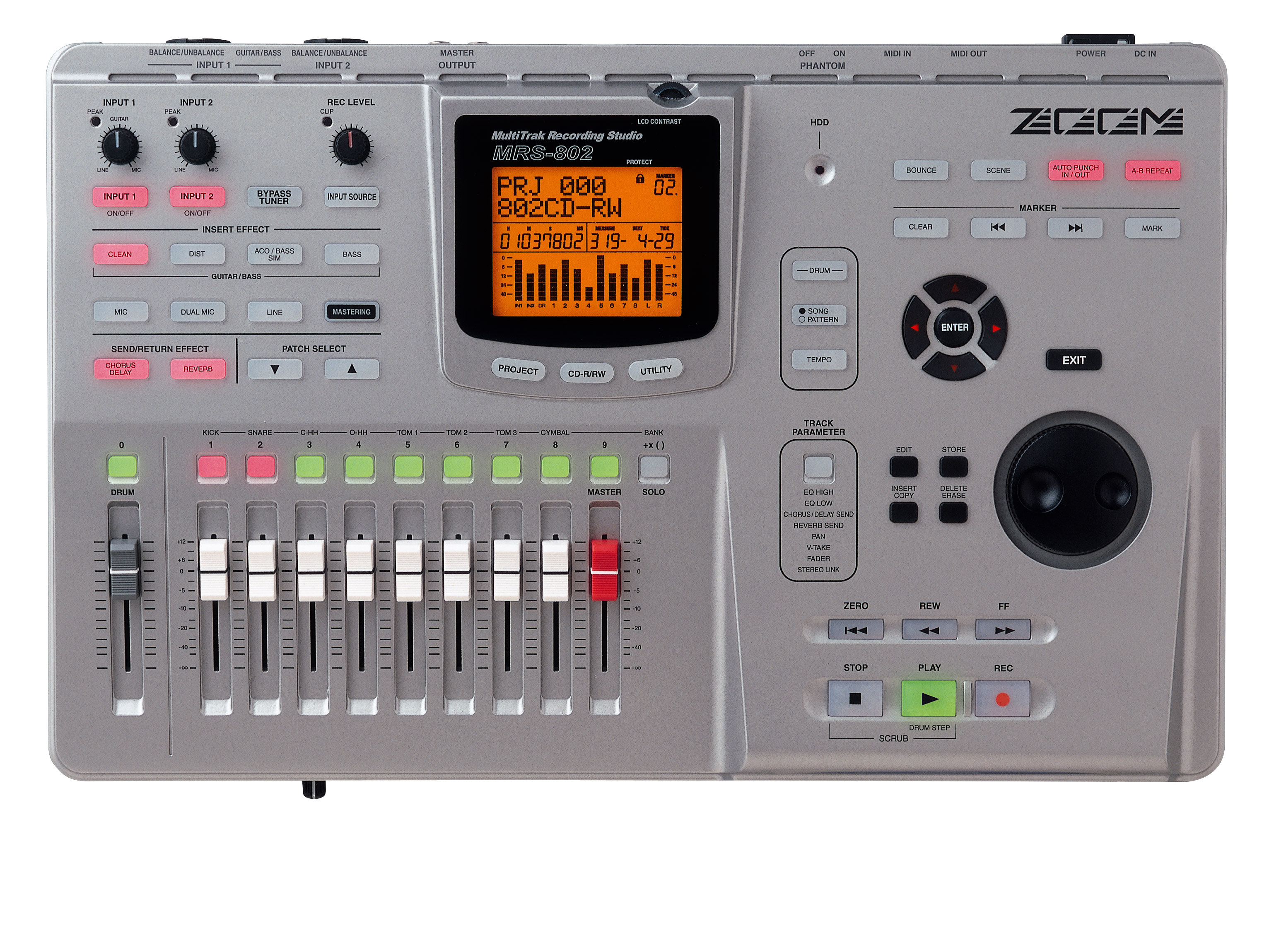 Zoom MRS802는 합리적인 가격에 8트랙 디지털 레코딩 환경을 제공하는 올인원 워크스테이션입니다. 20GB 하드 드라이브, 가상 트랙, 내장 드럼 머신, 이펙트, 스냅샷 자동화 등의 기능을 제공하여 뮤지션들이 간편하게 데모 또는 상업적인 음반을 제작할 수 있도록 설계되었습니다.