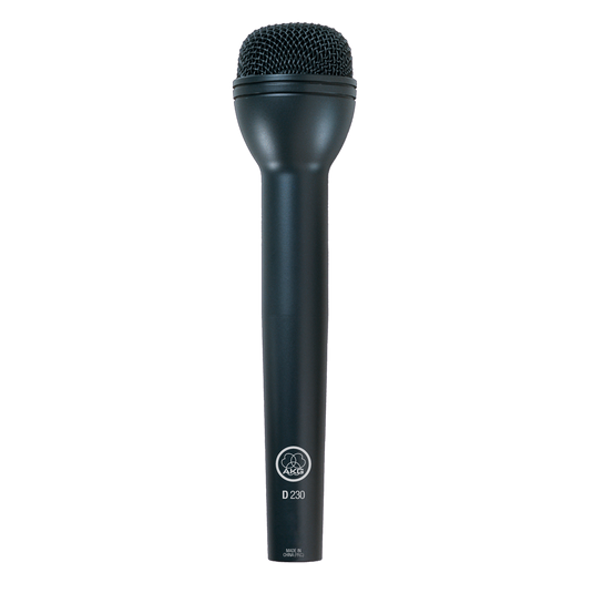 AKG D230은 현장 보도와 방송용으로 설계된 무지향성 다이나믹 마이크입니다. 견고한 금속 바디와 내장 윈드스크린을 갖추었으며, 전자기 간섭(EMI)과 험 노이즈에 대한 감도를 줄이는 내부 회로가 적용되어 안정적인 음질을 제공합니다.