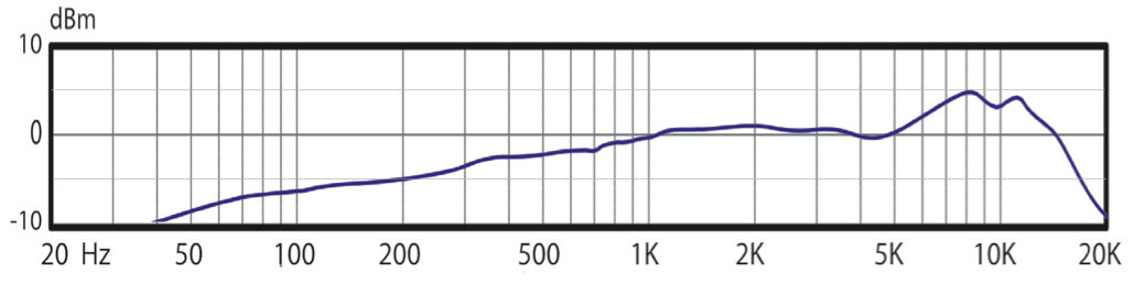 주파수 응답은 1kHz~4kHz 구간에서 ±1dB로 평탄하며, 저역은 40Hz에서 -10dB까지 완만하게 롤오프되고, 고역은 8kHz에서 +5dB 피크가 있습니다. 실제 악기 벨 가까이(15cm 이내)에서 사용하면 저역이 더 풍부하게 수음되어, 그래프상보다 더욱 자연스럽고 균형 잡힌 사운드를 제공합니다.