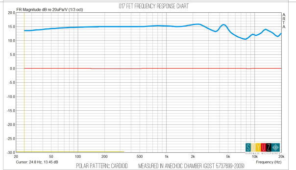 Soyuz SU-017FET은 러시아 Soyuz Microphones에서 2016년 출시한 대형 다이어프램 FET 콘덴서 마이크입니다. 플래그십 진공관 모델SU-017 Tube와 동일한 바디, 캡슐, 캡슐 교환 시스템을 채택했으며, 전자회로만 FET 방식으로 설계되었습니다.