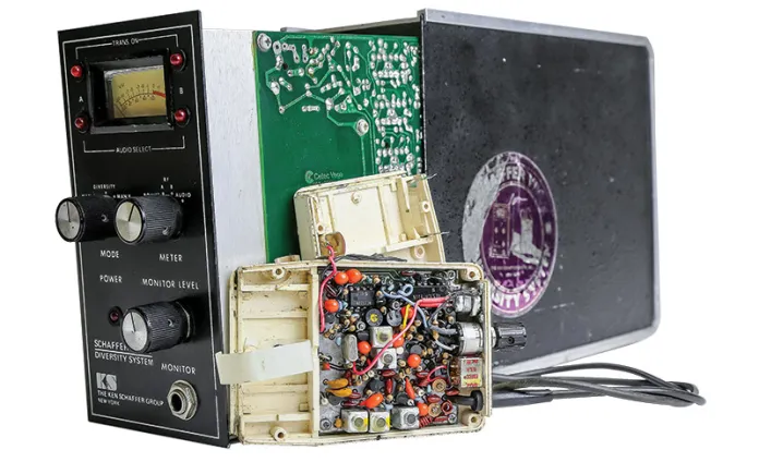 “우리는 다이버시티 수신을 도입했습니다,”라고 Schaffer는 언급했다. “다이버시티 없이는 뮤지션이 무대에서 움직일 때 신호가 끊길 수 있습니다. 진정한 다이버시티는 각각 자체 안테나가 있는 두 개의 별도 수신기를 요구하며, 안테나는 최소한 한 파장 이상 떨어져 있어야 합니다. 우리가 사용한 주파수 – 대략 180 MHz –에서는 파장이 약 6피트입니다. 파장 분리에서는 각각의 안테나가 자체 환경에 있고, 두 개의 안테나가 동시에 신호가 끊길 확률은 거의 없습니다. 우리는 신호 끊김이나 페이딩에 대해 불만을 제기하는 전화를 받은 적이 없습니다.”