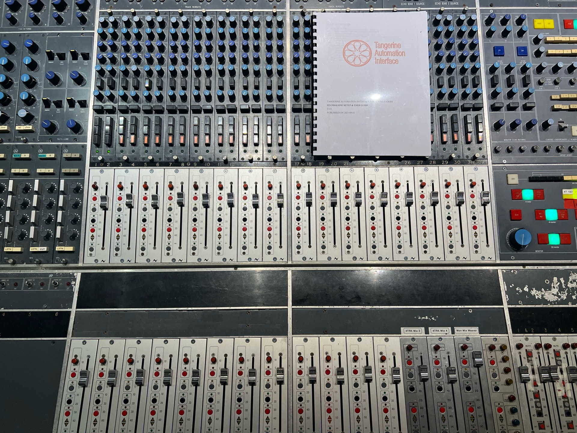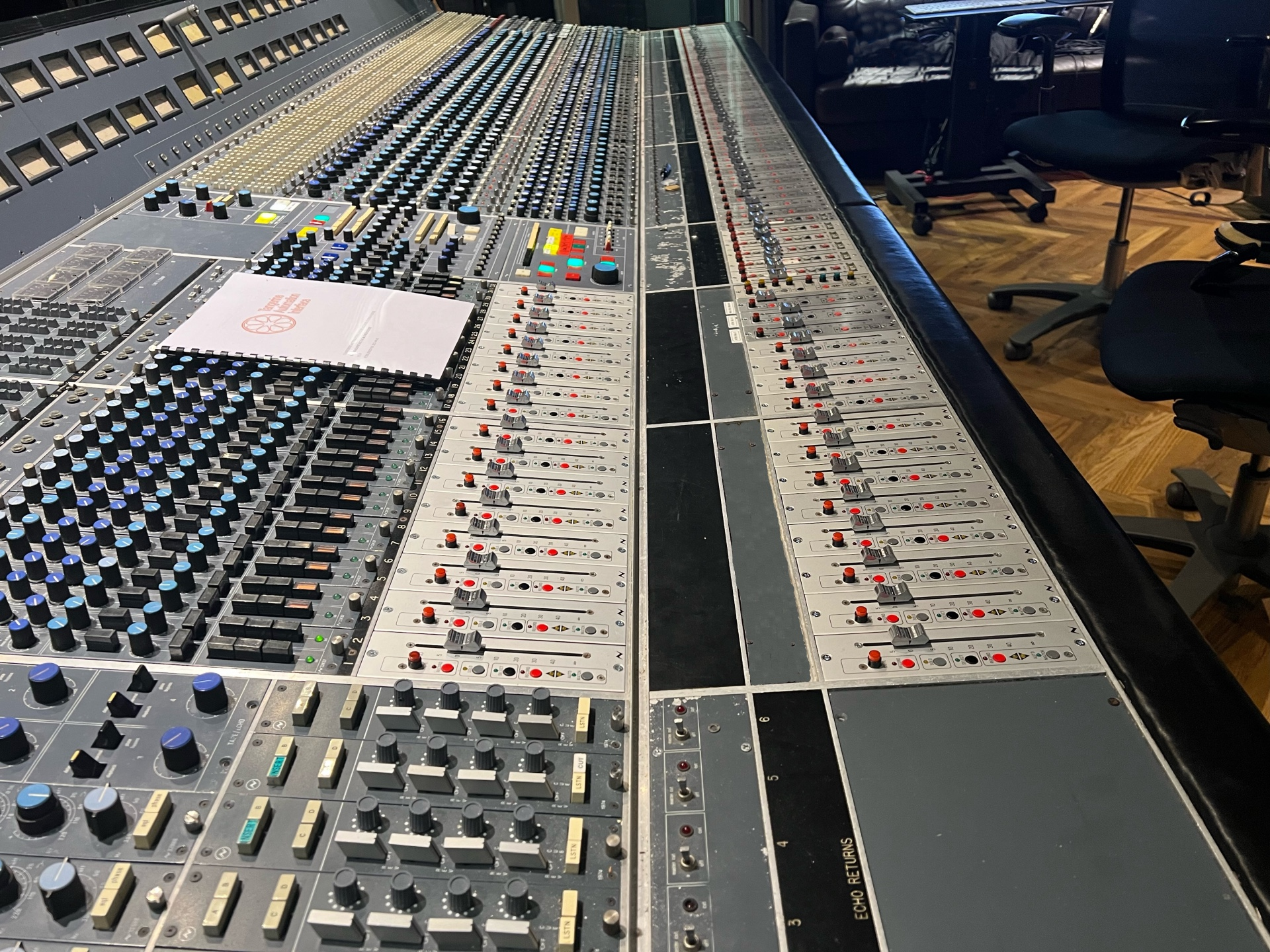 이 56채널, 24트랙 데스크는 TDA1034 Op-Amp를 사용하는 +-15V 레일 쌍을 중심으로 설계된 최초의 Neve 데스크였으며, 이후 NE5534A로 알려지게 되었습니다. 표준 오디오 Neve 트랜스포머 대신 모두 트로이달 형태로 감겨져 있습니다. 31106 EQ 모듈의 주파수는 George와 Rupert가 가장 음악적으로 유용하다고 선택한 것입니다. 이 모듈들은 이 데스크에만 독특하며, 34427 원격 마이크 프리앰프도 그렇습니다. 이 프리앰프들은 스튜디오 라이브 영역에 위치하며 “팬텀” 전류 신호를 통해 원격으로 제어됩니다. 32436 보조 모듈은 6개의 모노와 1개의 스테레오 송신을 제공합니다.
