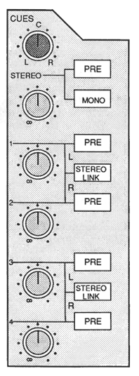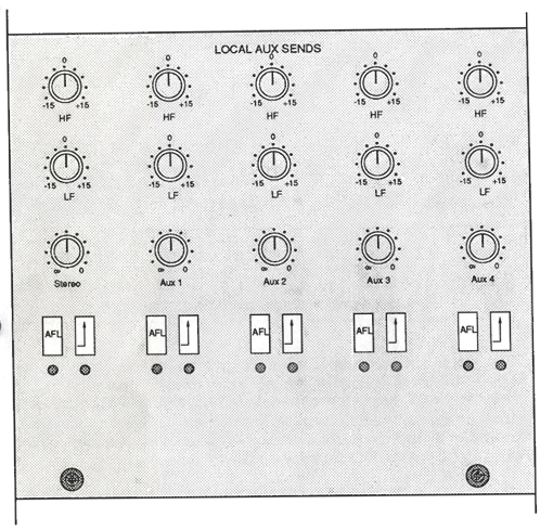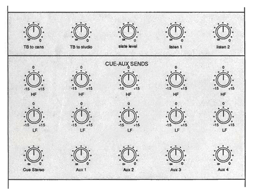 SSL 4000의 AUX 센드는 1개의 스테레오 센드인 CUE와 4개의 모노 센드인 AUX로 구성되어 있다. 보통 CUE는 연주자에게 CUE 믹스를 줄 때 사용하고 AUX 센드는 리버브 등의 센드 이펙터에 입력 시킬 때 사용한다.