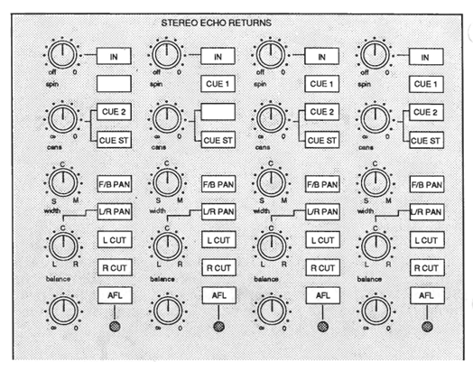 각 채널의 CUE 및 AUX send 에 대한 Return 을 조정 할 수 있다. 단 스테레오 채널로 이펙터를 리턴한 경우에는 해당 스테레오 채널이 리턴 채널로 작동하고, 이 섹션은 사용되지 않는다.