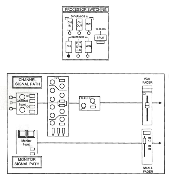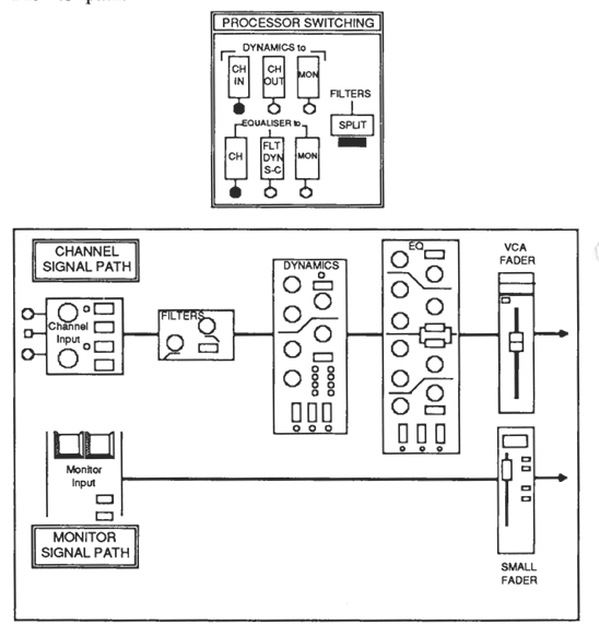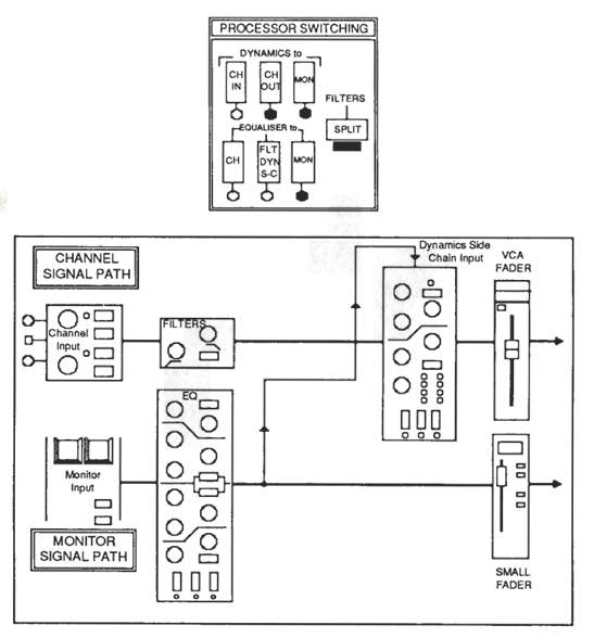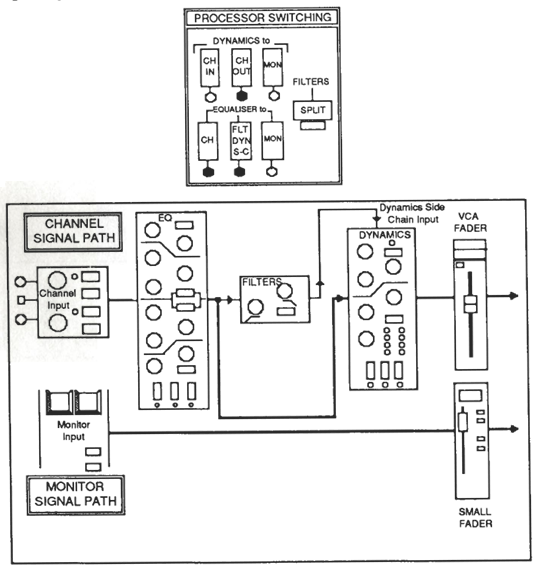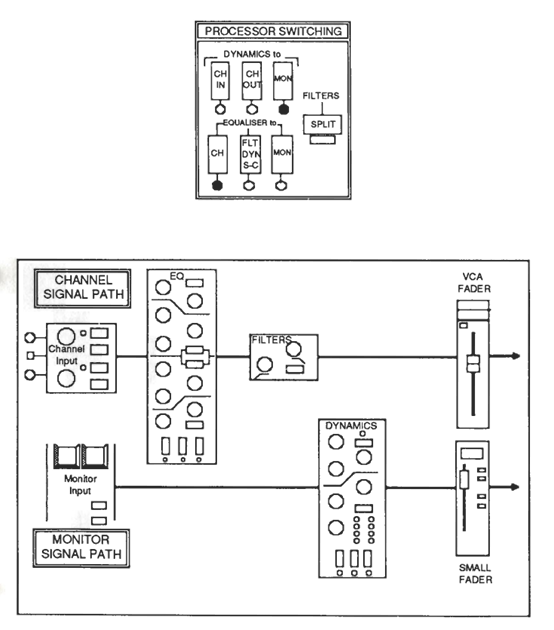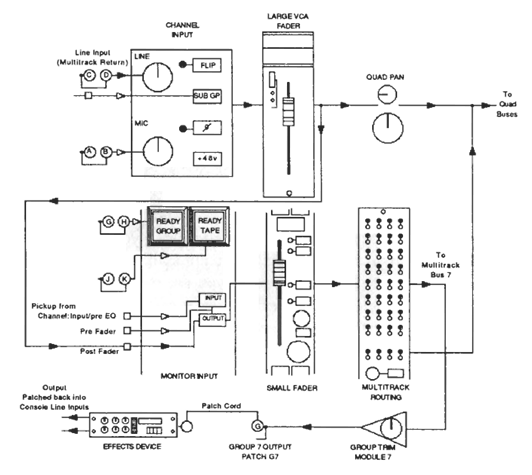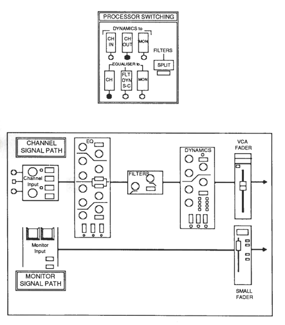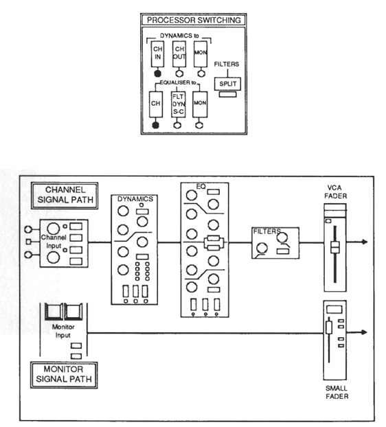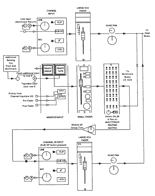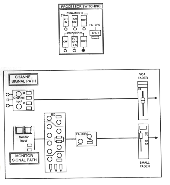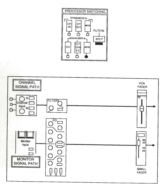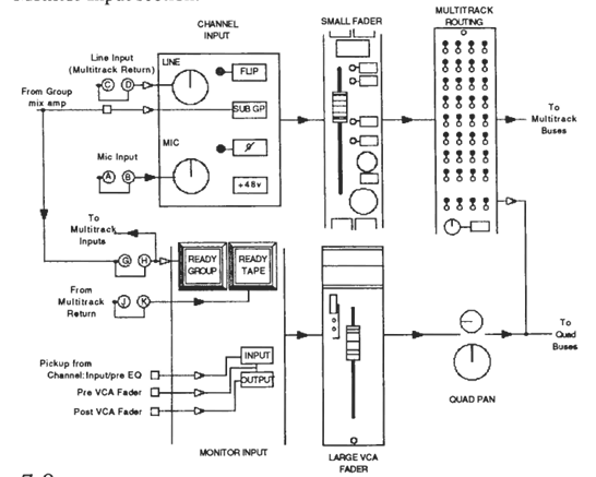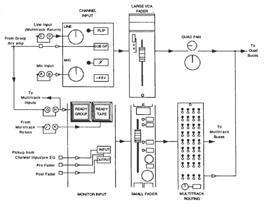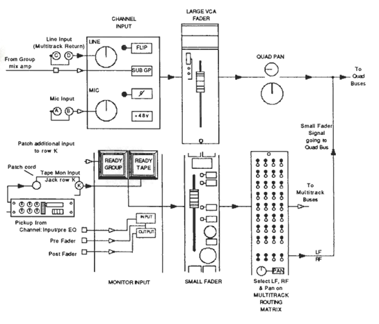 전체적으로 플레이백 재생을 위한 스몰 페이더, 녹음 및 인풋 모니터링에 사용하는 라지 페이더가 한 채널에 동시에 있는 인라인 구조로 되어 있으며, 실제 신호를 서브 그룹 채널로 서밍하는 SUB Group과 페이더만 그룹으로 조정하는 VCA 그룹 페이더가 동시에 있는 매우 현대적인 콘솔 구조로 되어 있다.