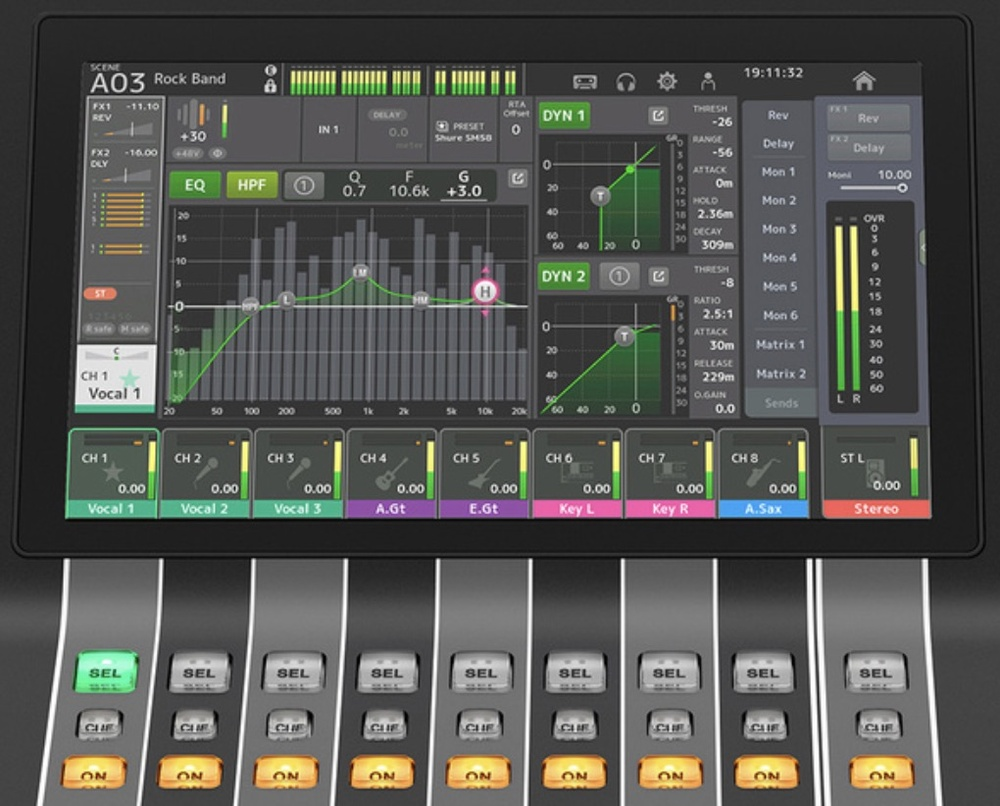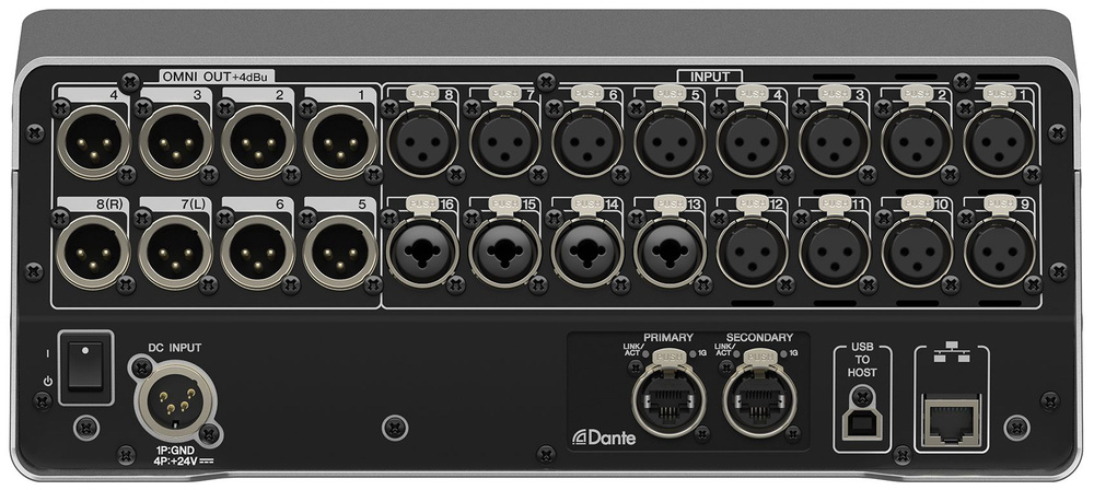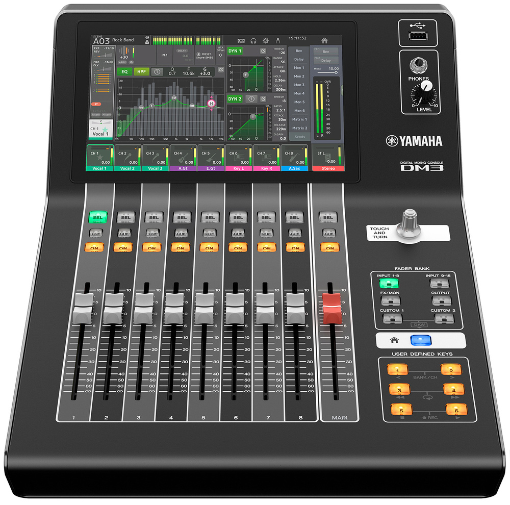 Yamaha DM3은 18개의 입력을 믹싱할 수 있는 소형 디지털 믹싱 콘솔로, 16개의 온보드 마이크 프리앰프와 '8+1' 페이더 구성을 제공합니다. 내부 처리는 96kHz로 실행되지만 필요한 경우 클럭을 48kHz로 설정할 수 있습니다. 메인 스테레오 버스 외에도 6개의 추가 Aux 믹스 버스, 2개의 매트릭스 버스 및 2개의 내부 이펙트 버스가 있습니다. 로컬 입출력은 모두 후면 패널의 XLR로 되어 있으며, 4개의 입력은 콤보 XLR/TRS 커넥터를 가지고 있습니다.