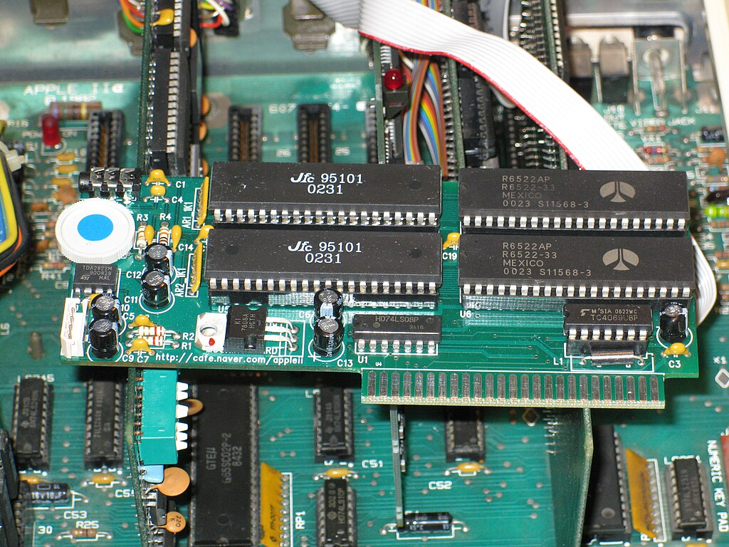 - Mockingboard A: AY-3-8913 칩 2개 (6채널 제공), SSI-263 음성 칩을 위한 소켓 2개 제공.