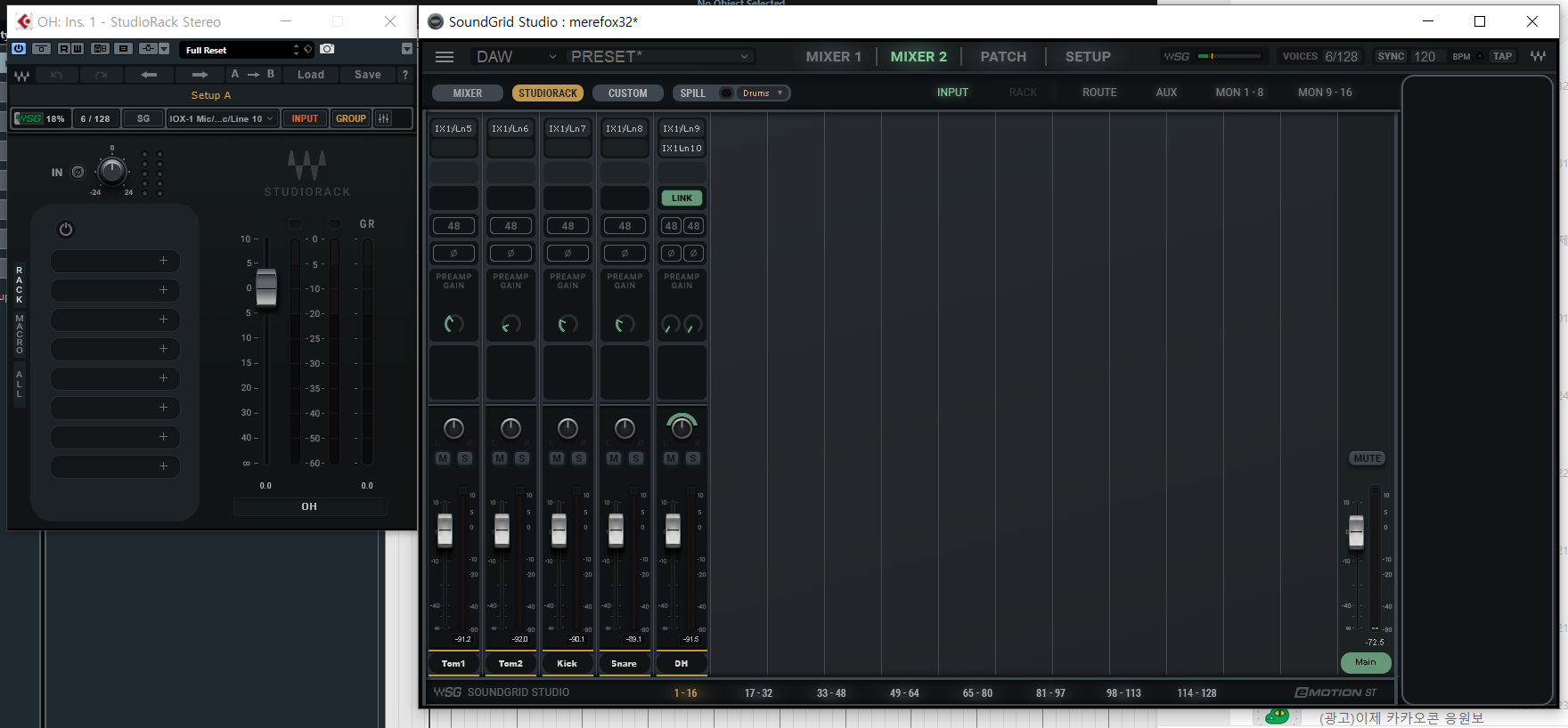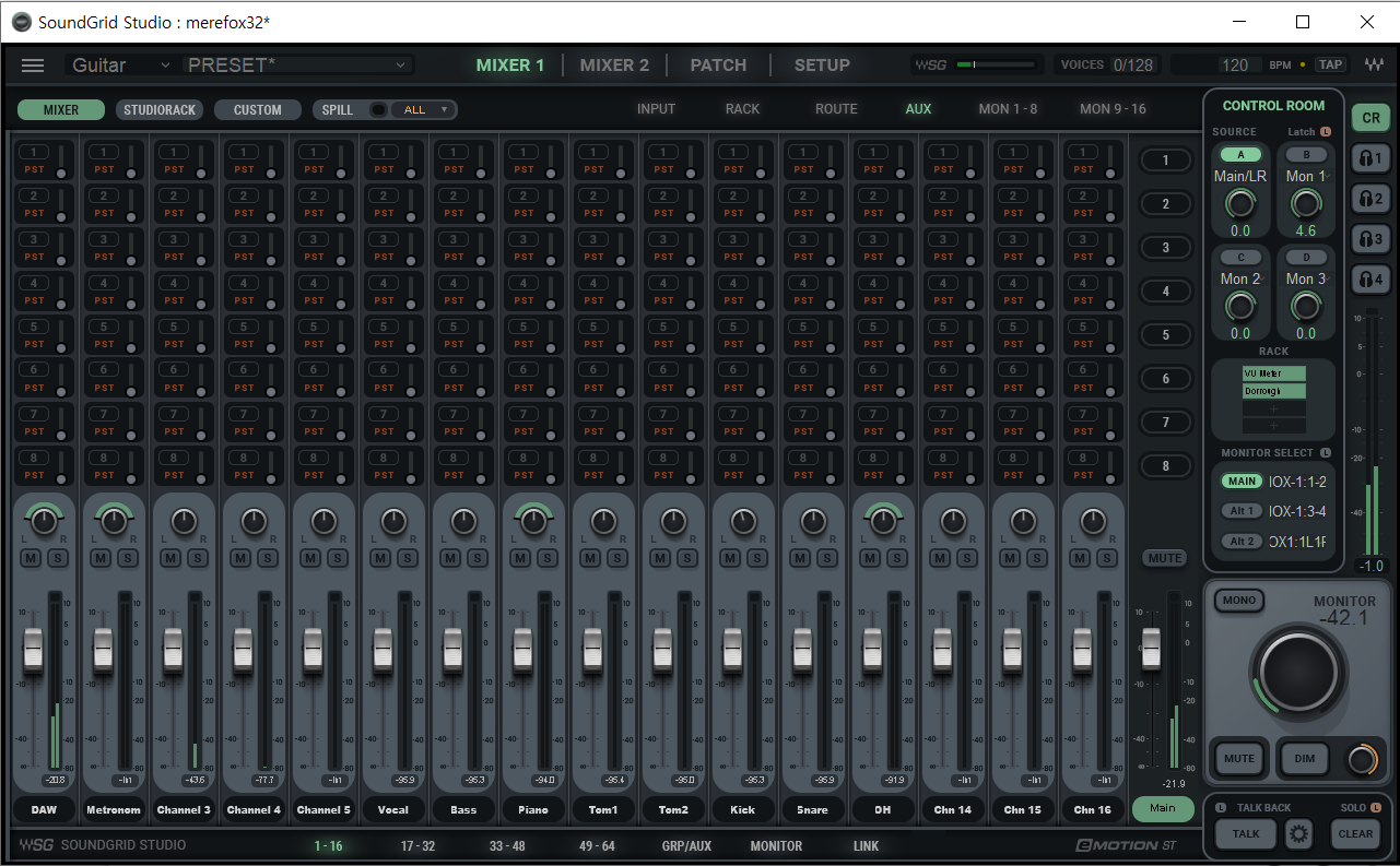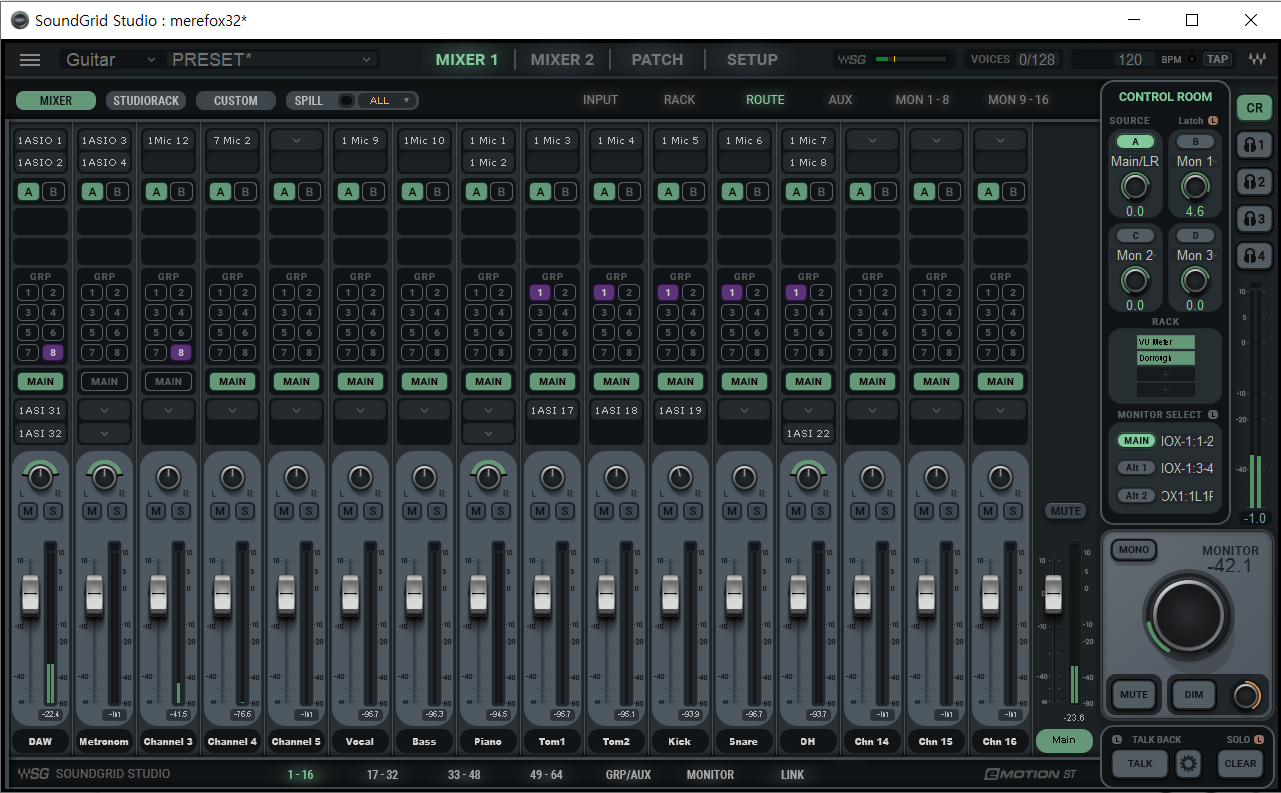 여기도 일반 믹서 채널과 동일하게 Input, Route, AUX, MON 등에 대해 컨트롤 할수 있다.플러그인을 거는 Rack 에 대한 부분은 잠겨있는데, DAW 에 걸은 StudioRack 플러그인 안에서 조정해야 한다.