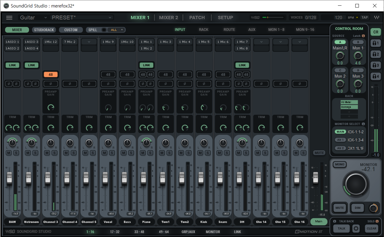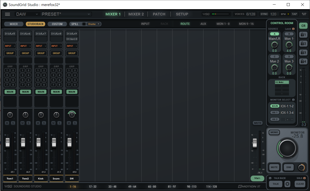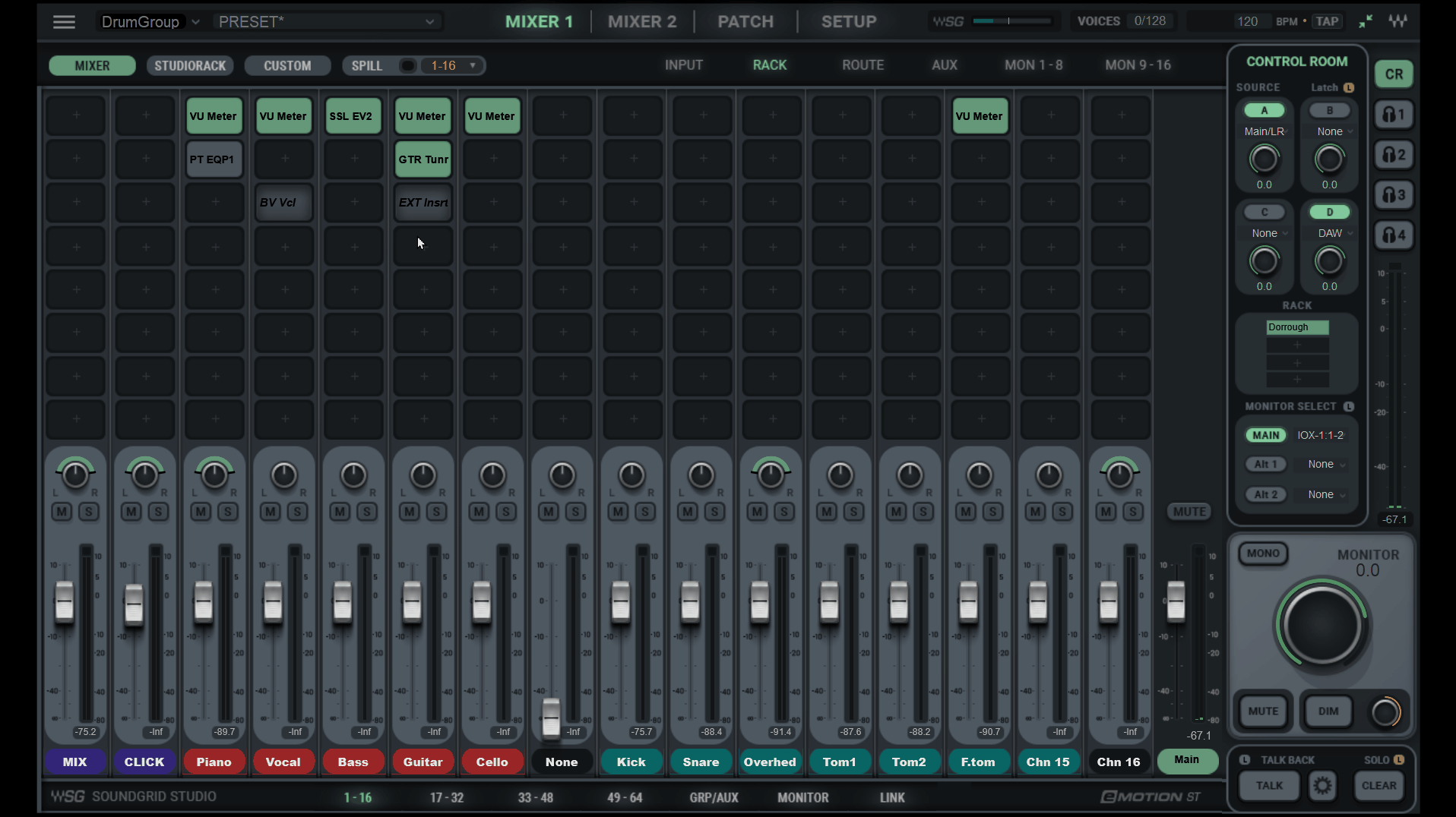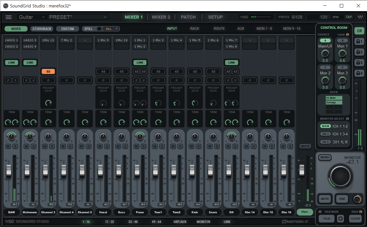 여기도 일반 믹서 채널과 동일하게 Input, Route, AUX, MON 등에 대해 컨트롤 할수 있다.플러그인을 거는 Rack 에 대한 부분은 잠겨있는데, DAW 에 걸은 StudioRack 플러그인 안에서 조정해야 한다.